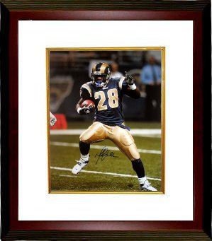 Marshall Faulk was traded to the St. Louis Rams in 1998. Marshall is one of the 3 players (Marcus Allen & Tiki Barber) to reach at least 10,000 rushing yards and 5,000 receiving yards in his career and the only one to have 12,000 yards rushing, 6,000 yards receiving. His seven two-point conversions are an NFL record. His 5 games of 250+ yards from scrimmage and 14 games of 200+ yards from scrimmage are also NFL records. Marshall Faulk is the only player to have 70+ rushing touchdowns and 30+ receiving touchdowns. Marshall Faulk has hand autographed this St. Louis Rams 16x20 Photo. Custom White Mat and Premium Mahogany Color Framed as shown. Faulk Hologram and Certificate of Authenticity from Athlon Sports.
