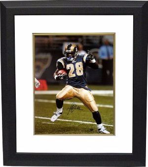 Marshall Faulk was traded to the St. Louis Rams in 1998. Marshall is one of the 3 players (Marcus Allen & Tiki Barber) to reach at least 10,000 rushing yards and 5,000 receiving yards in his career and the only one to have 12,000 yards rushing, 6,000 yards receiving. His seven two-point conversions are an NFL record. His 5 games of 250+ yards from scrimmage and 14 games of 200+ yards from scrimmage are also NFL records. Marshall Faulk is the only player to have 70+ rushing touchdowns and 30+ receiving touchdowns. Marshall Faulk has hand autographed this St. Louis Rams 16x20 Photo. Custom White Mat and Black Color Framed as shown. Faulk Hologram and Certificate of Authenticity from Athlon Sports.