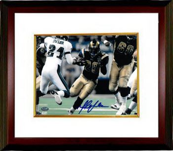 Marshall Faulk was traded to the St. Louis Rams in 1998. Marshall is one of the 3 players (Marcus Allen & Tiki Barber) to reach at least 10,000 rushing yards and 5,000 receiving yards in his career and the only one to have 12,000 yards rushing, 6,000 yards receiving. His seven two-point conversions are an NFL record. His 5 games of 250+ yards from scrimmage and 14 games of 200+ yards from scrimmage are also NFL records. Marshall Faulk is the only player to have 70+ rushing touchdowns and 30+ receiving touchdowns. He was elected to the Pro Football Hall of Fame in 2011. Marshall Faulk has hand autographed this St. Louis Rams 8x10 Photo. Faulk Hologram and Certificate of Authenticity from Athlon Sports Collectibles. Custom White Mat and Premium Mahogany Color Framed as shown.