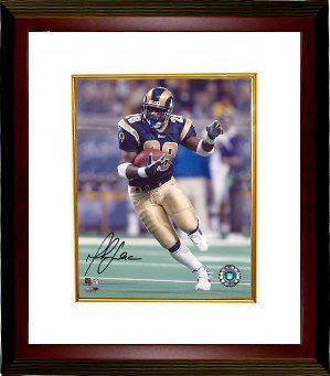 Marshall Faulk was traded to the St. Louis Rams in 1998. Marshall is one of the 3 players (Marcus Allen & Tiki Barber) to reach at least 10,000 rushing yards and 5,000 receiving yards in his career and the only one to have 12,000 yards rushing, 6,000 yards receiving. His seven two-point conversions are an NFL record. His 5 games of 250+ yards from scrimmage and 14 games of 200+ yards from scrimmage are also NFL records. Marshall Faulk is the only player to have 70+ rushing touchdowns and 30+ receiving touchdowns. Marshall Faulk has hand autographed this St. Louis Rams 8x10 Photo. Custom White Mat and Premium Mahogany Color Framed as shown. Faulk Hologram and Certificate of Authenticity from Athlon Sports.