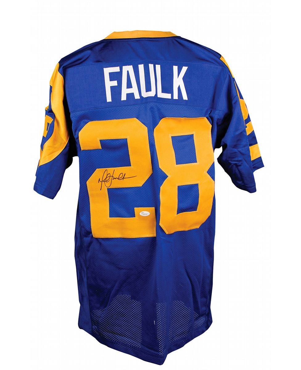 Replica St. Louis Rams football jersey, with sewn on letters and numbers, signed in black felt tip on the number on the back. In fine condition, with a JSA authentication label affixed to number.