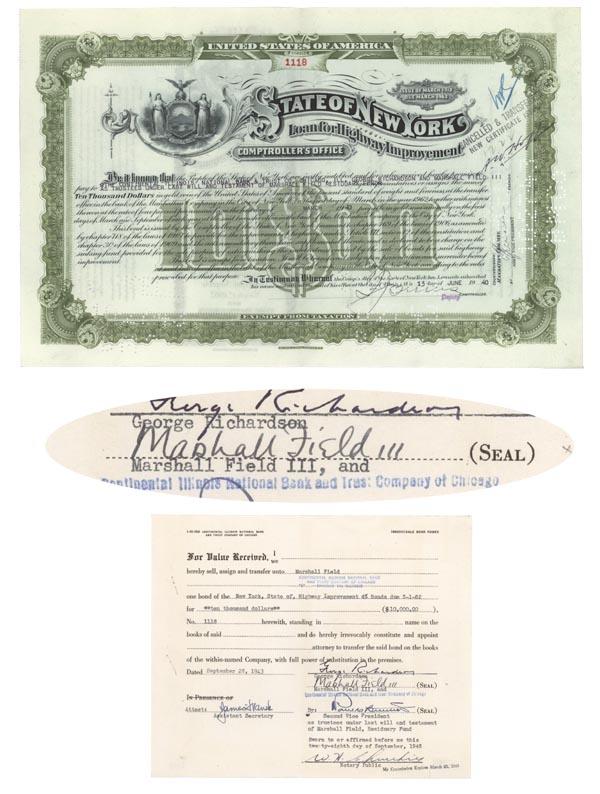 1940, New York. $10,000 Bond for Highway Improvement bearing 4% interest. Olive/Black. Engraved vignette of the state seal at top left. Signed on the accompanying stock transfer by MARSHALL FIELD III (1893 - 1956): Publisher. Using the great wealth he inherited from his grandfather, the Chicago Merchant and founder of Marshall Field & Company, Field built a large communications empire which included the Chicago Sun-Times, publishing houses such as Simon & Schuster, a music company, and numerous radio stations. Several staple holes at top. Punch cancellations on bond do not affect Field's signature which is bold and clean. Extremely Fine.