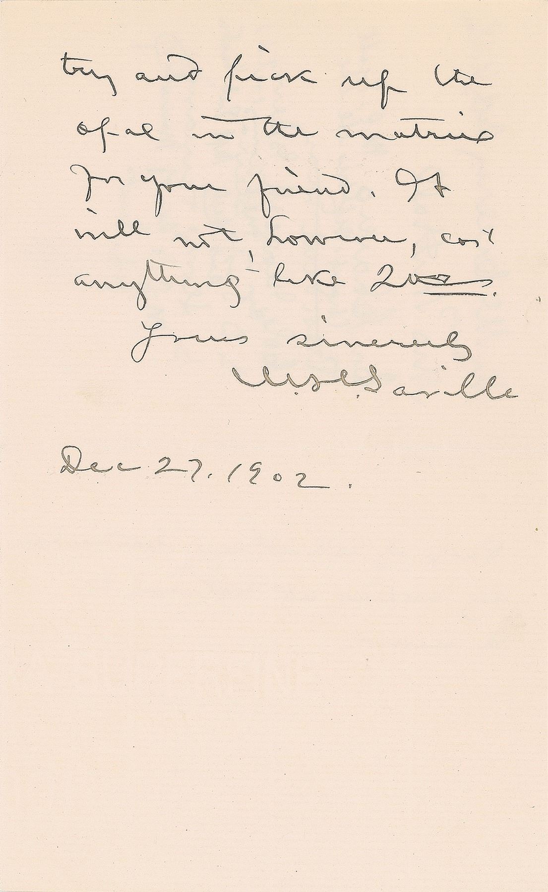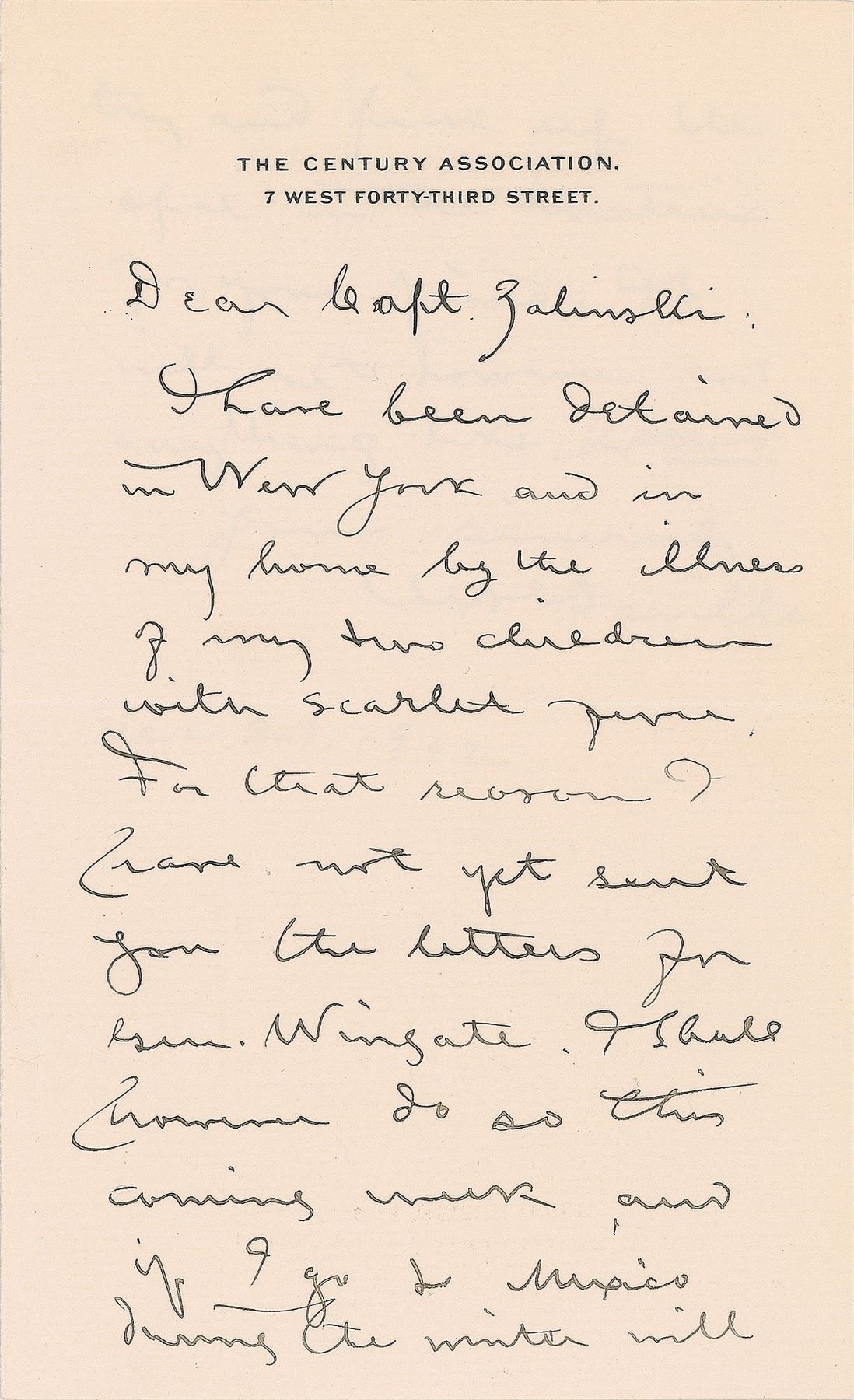 American archaeologist (1867–1935) who made important discoveries among the mound builders in southern Ohio. ALS signed “M. H. Saville,” two pages on two adjoining sheets, 4.75 x 7.75, The Century Association letterhead, December 27, 1902. Letter to Captain E. L. Zalinski, in part: "I have been detained in New York and in my home by the illness of my two children with scarlet fever. For that reason I have not yet sent you thd letters for Gen. Wingate. I shall however do so this coming week." In fine condition.