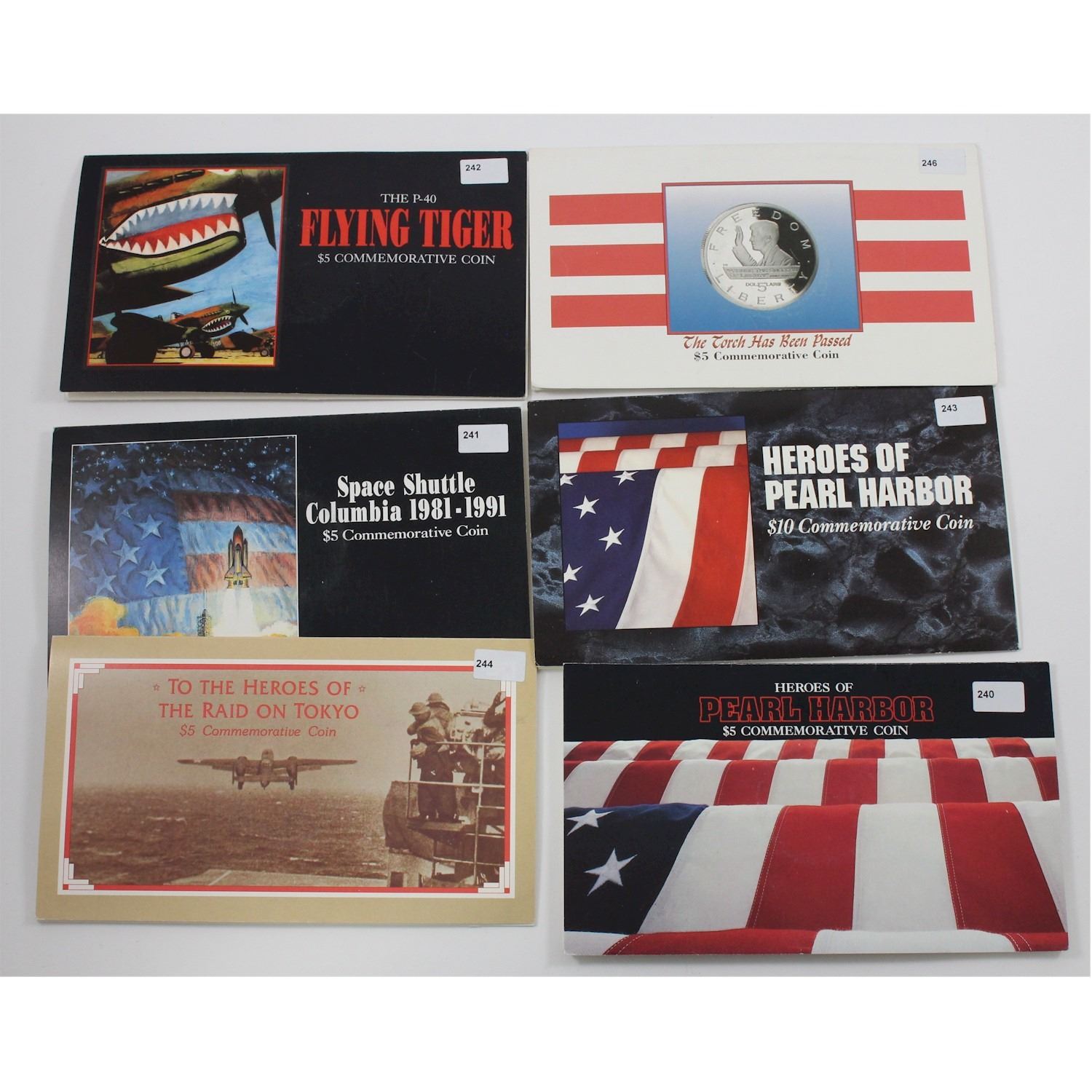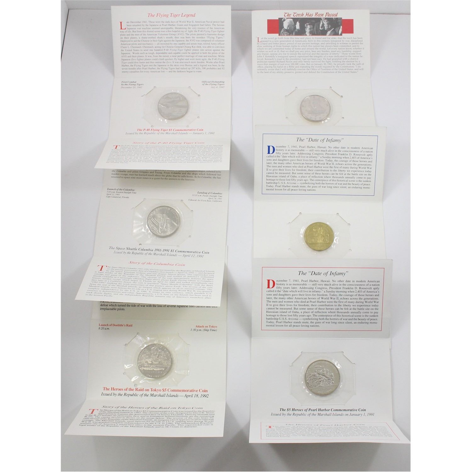 Marshall Islands Estate Collection Sets: Heroes of Pearl Harbour $10, the Torch Has Been Passed $5, To the Heroes of the Raid on Tokyo $5, Space Shuttle Columbia 1981-1991 $5, The P-40 Flying Tiger $5 & Heroes of Pearl Harbour $5. 6 sets. Very interesting pieces of history commemorated in these sets. Each set includes background history about each event.