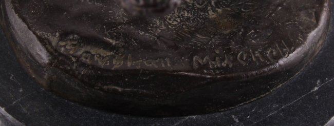 Marshall Mitchell (1917-), "Eagle Dancer" bronze sculpture signed "Marshall Mitchell", a well known listed artist working with Native American theme bronzes. (Size: See second photo for measurement.) Photos are part of the description representing the condition report. Pangaea Auctions urges Bidder's to view all attached photos.