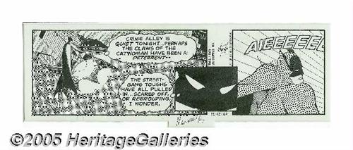 <B>Marshall Rogers - Batman Daily Comic Strip Original Art, dated 12-12-89 (Creators Syndicate, 1989).</B></I> Perched on a streetlight, Batman finds Crime Alley quiet. Since Catwoman has been prowling around, the gangs have pulled off the streets -- if only for a moment! Marshall Rogers returns to Gotham's guardian in this <I>Batman</B></I> daily. The image area measures 12" x 3.5," and the art is in Excellent condition. Signed by Marshall Rogers at the bottom.