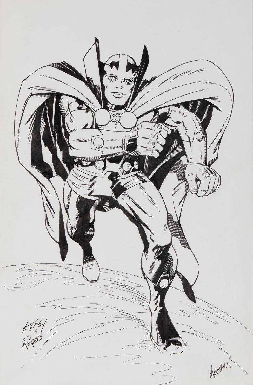 182. Marshall Rogers original lightbox artwork of a "Mr. Miracle" drawing by Jack Kirby. (ca. 1990s) Accomplished in ink on 11 x 17 in. art board. Very nice finished ink drawing by Rogers of Jack Kirby's "Fourth World" character "Mr. Miracle". Note: there are no Kirby pencils on this page. Rogers lightboxed a Kirby image to produce this ink rendering. In very good condition. $500 - $700