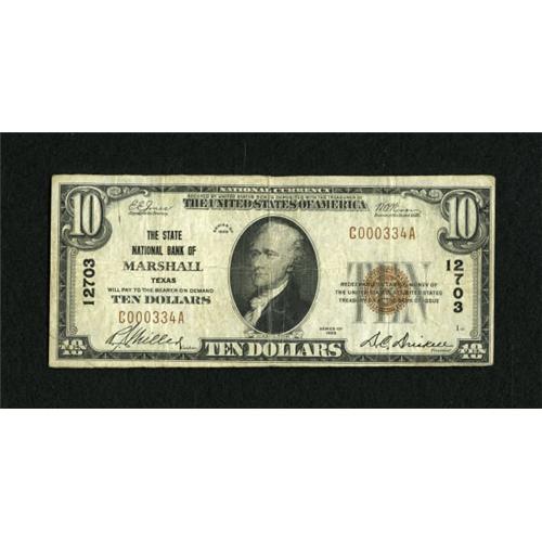 <B>Marshall, TX</B></I> - $10 1929 Ty. 1 <B>The State NB</B></I> Ch. # 12703<BR> Thirteen small size notes are known on this institution. <B>Fine</B></I>, with signatures of R.J. Miller and D.C. Driskell.<BR><BR><b>Shipping:</b> Coins & Currency (<a target="_blank" href="http://www.heritageauctions.com/common/shipping.php">view shipping information</a>)
