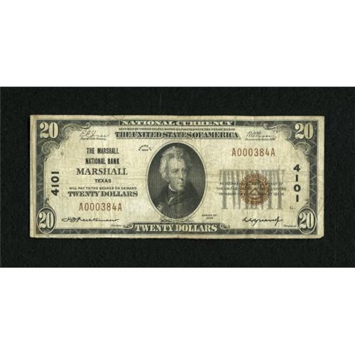 <B>Marshall, TX</B></I> - $20 1929 Ty. 1 <B>The Marshall NB</B></I> Ch. # 4101<BR> Just over a dozen and a half small size notes are recorded in the census from this bank. <B>Fine</B></I>, signed by H.D. Aechernacht and W.C. Pierce.<BR><BR><b>Shipping:</b> Coins & Currency (<a target="_blank" href="http://www.heritageauctions.com/common/shipping.php">view shipping information</a>)