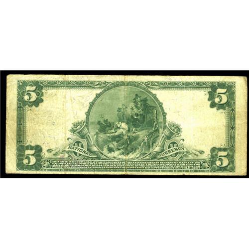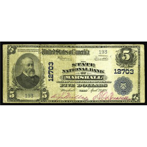 <B>Marshall, TX</B></I> - $5 1902 Plain Back Fr. 609 <B>The State NB</B></I> Ch. # 12703<BR>While small notes are occasionally offered from here, large examples are scarce indeed, with the census standing at just six pieces, one of which is held by the Moody Foundation. With a meager $920 outstanding in large by 1935, don't look for too many more examples to surface either. Most of the known specimens are quite low grade. This piece however is a happy exception. <B>Fine-Very Fine,</B></I> with bright purple signatures.