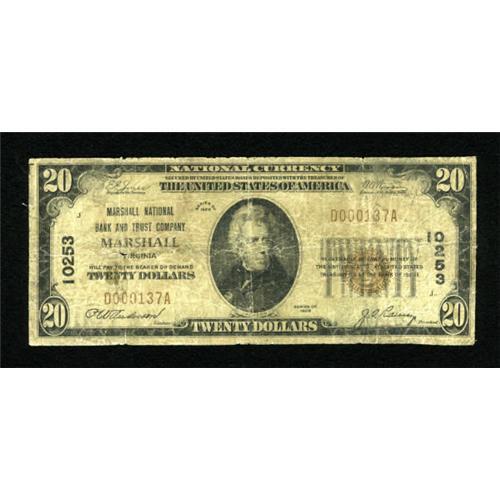 <B>Marshall, VA</B></I> - $20 1929 Ty. 1 <B>Marshall NB & TC</B></I> Ch. # 10253<BR> This is a well circulated issue from a one bank town. The margins are interrupted by some minor splits. <B>Good-Very Good.</B></I><BR><BR><b>Shipping:</b> Coins & Currency (<a target="_blank" href="http://www.heritageauctions.com/common/shipping.php">view shipping information</a>)