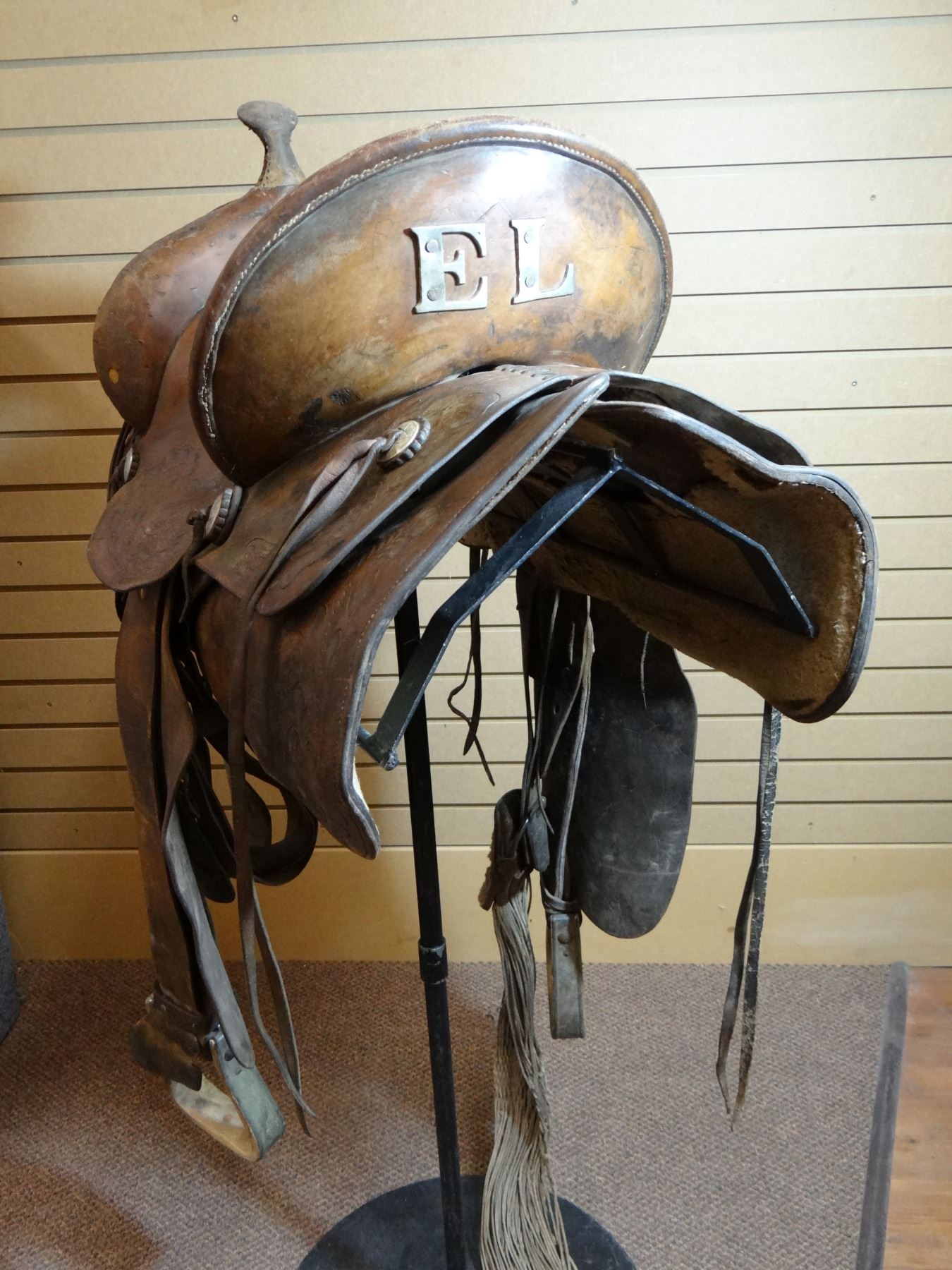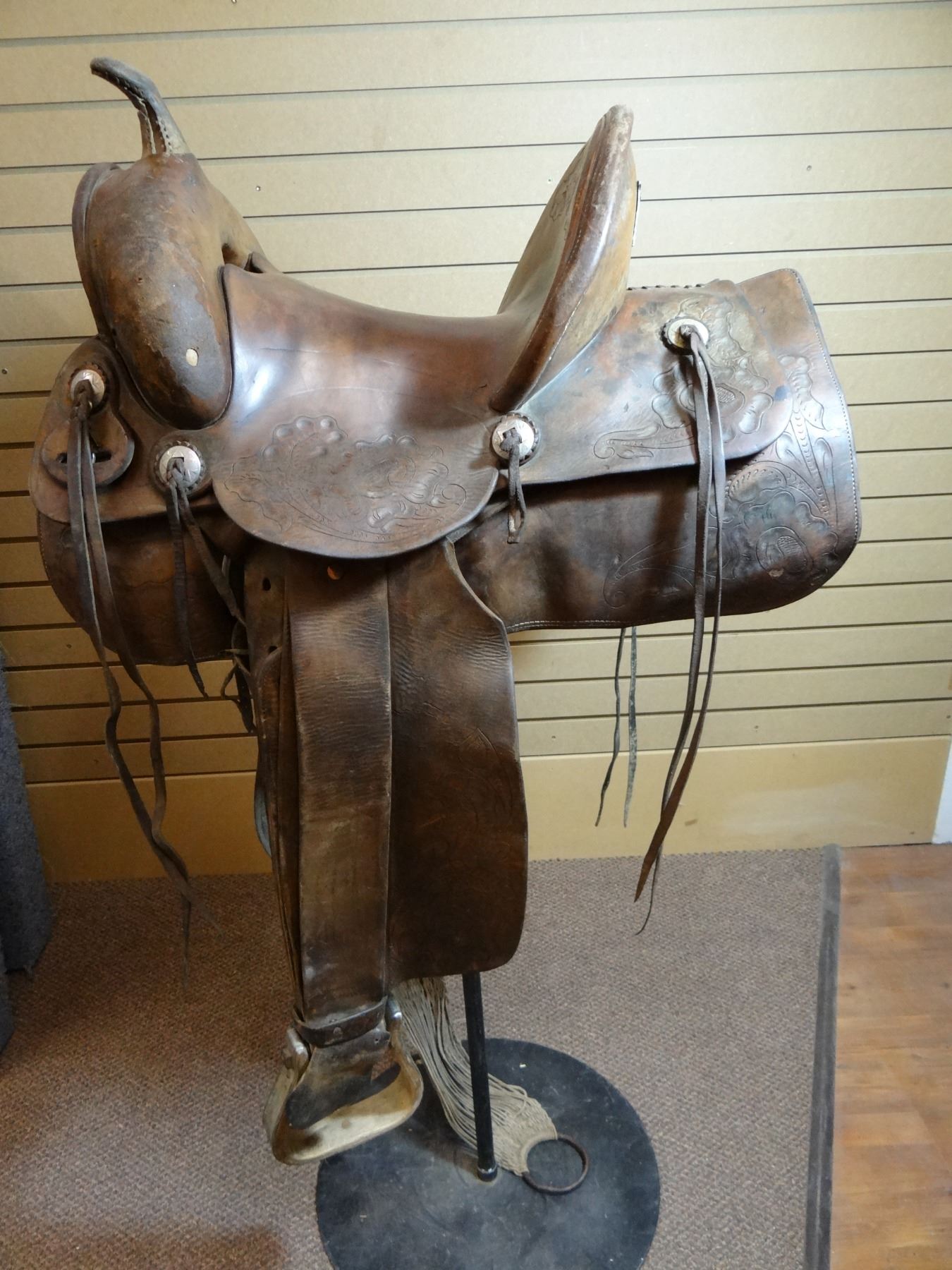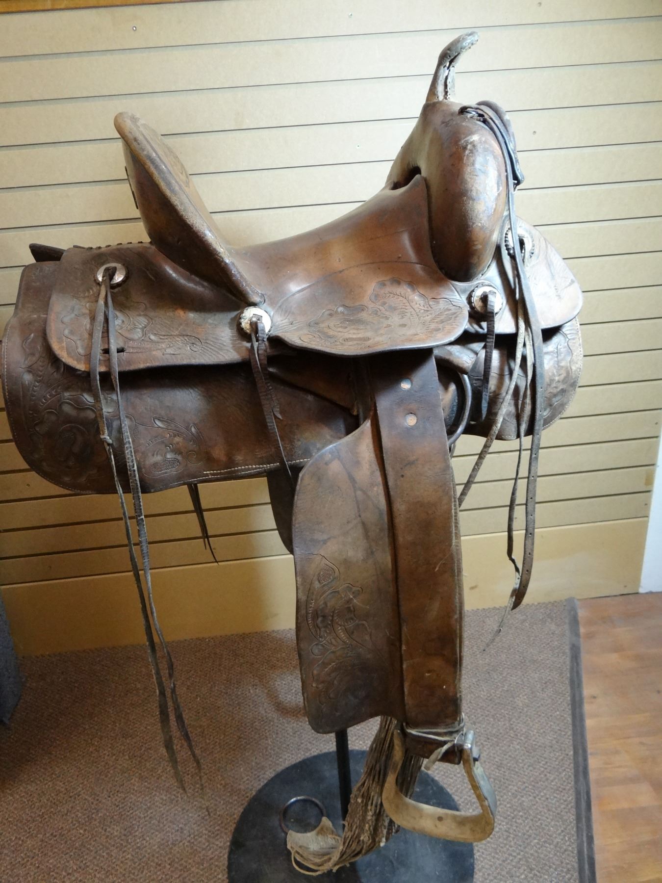 Marshall-Wells square skirt saddle, Portland, OR, 13 1/2", full flower tooled. Belonged to Ed Leipheimer, Butte, MT, died @ 95 in 2010