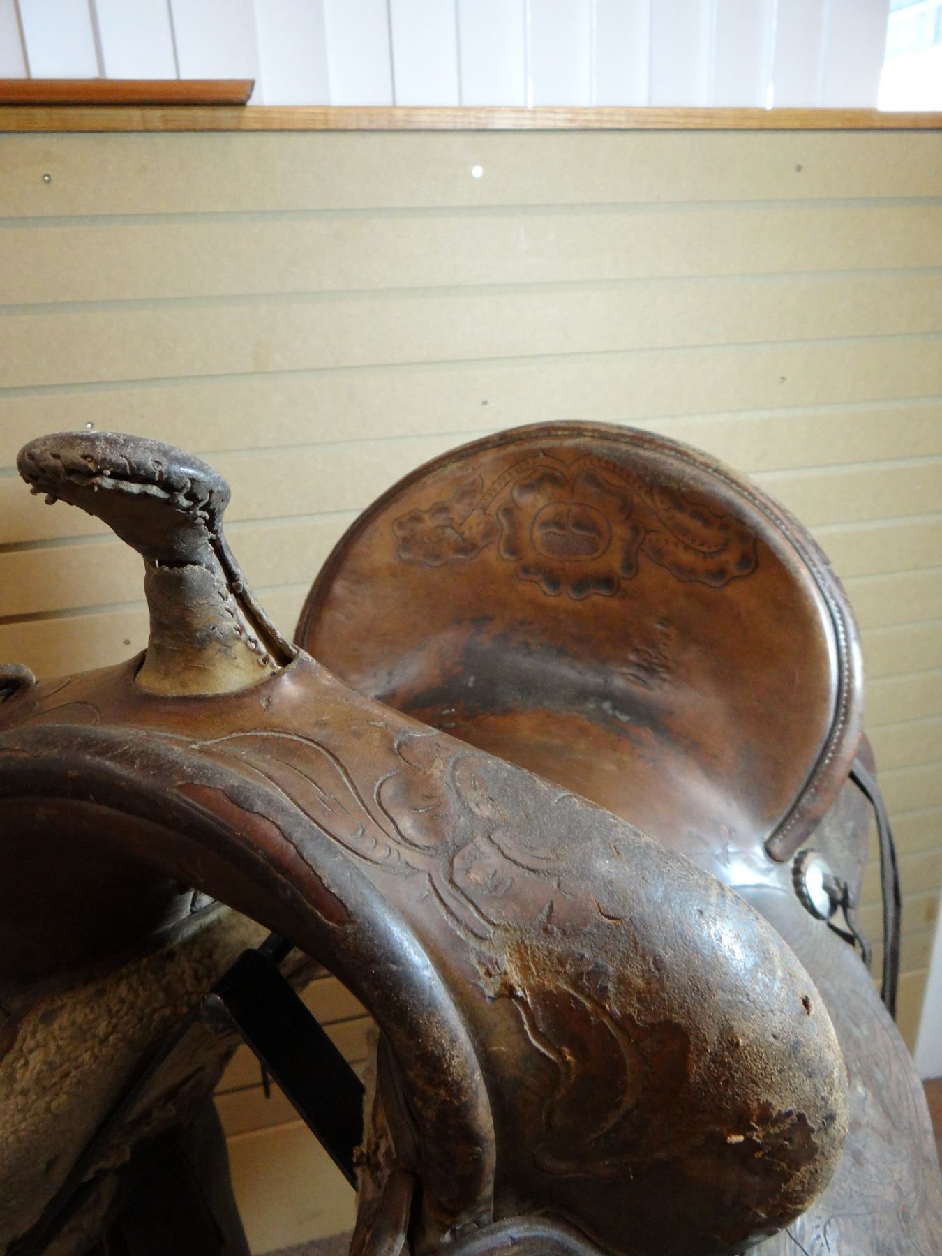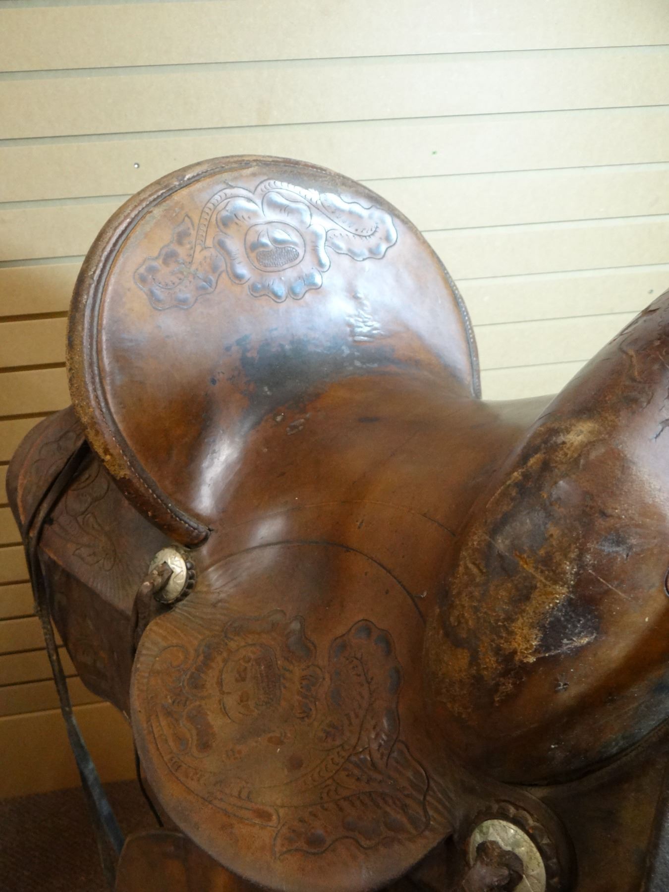 Marshall-Wells square skirt saddle, Portland, OR, 13 1/2", full flower tooled. Belonged to Ed Leiphe
