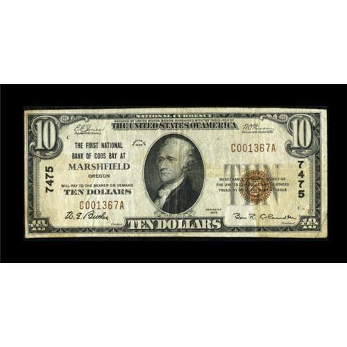 <B>Marshfield, OR</B></I> - $10 1929 Ty. 1 <B>The First NB of Coos Bay</B></I> Ch. # 7475<BR> An always sought after note which bears a neat title. <B>Fine+.</B></I><BR><BR><b>Shipping:</b> Coins & Currency (<a target="_blank" href="http://www.heritageauctions.com/common/shipping.php">view shipping information</a>)