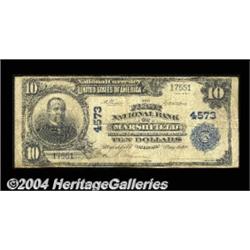 Marshfield, WI - $10 1902 Plain Back Fr. 627 The First NB Ch. # 4573Although there were two issuing banks in this Wood County locale, this was the only institution to have large size printed. This Fine example is a new addition to the census. <BR><BR><B>Important notice:</B> Heritage usually auctions material at the rate of 200-250 lots per hour. On some occasions eBay Live bid software or the Internet may not be able to keep up with the pace of the auction. We recommend placing a realistic absentee bid now as insurance to avoid disappointment. Occasionally the auctioneer may eliminate or reject an eBay Live bid, and the auctioneer may also reopen a lot after the close of the eBay live bidding (usually because we missed an audience bid), and may reject your bid even if it shows you as the winning bidder. By bidding via eBay Live, you agree that Heritage may award the lot to another bidder at its sole discretion under the circumstances described above or any other reasonable circumstances. Since eBay bids are not shown to us until we open the lot on the floor, we treat those bids just like floor bids. In most cases the floor responds before the eBay bid is presented to us, due to Internet lag time, so for consistency we have made it a policy that floor bids are always considered first over tie eBay live bids. Also please note that all Heritage lots purchased through eBay Live carry a 20% Buyer's Premium. Please make sure you read the Terms and Conditions before you bid. <BR><BR><B>IMPORTANT ANNOUNCEMENT ABOUT RESERVES:</B> Heritage now divulges all reserves on its web site 7 days before every auction. If you want to know whether the reserve on this lot has been met, and if not, what the reserve amount is, please visit this lot page on the HeritageCoin.com web site, or email: bid@HeritageGalleries.com