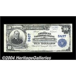 Marshfield, WI - $10 1902 Plain Back Fr. 633 The American NB Ch. # 5437An attractive Very Fine from the home of the well known Marshfield Clinic, founded in 1916 and now employing in excess of 700 physicians in its 40+ upper Midwest locations. <BR><BR><B>Important notice:</B> Heritage usually auctions material at the rate of 200-250 lots per hour. On some occasions eBay Live bid software or the Internet may not be able to keep up with the pace of the auction. We recommend placing a realistic absentee bid now as insurance to avoid disappointment. Occasionally the auctioneer may eliminate or reject an eBay Live bid, and the auctioneer may also reopen a lot after the close of the eBay live bidding (usually because we missed an audience bid), and may reject your bid even if it shows you as the winning bidder. By bidding via eBay Live, you agree that Heritage may award the lot to another bidder at its sole discretion under the circumstances described above or any other reasonable circumstances. Since eBay bids are not shown to us until we open the lot on the floor, we treat those bids just like floor bids. In most cases the floor responds before the eBay bid is presented to us, due to Internet lag time, so for consistency we have made it a policy that floor bids are always considered first over tie eBay live bids. Also please note that all Heritage lots purchased through eBay Live carry a 20% Buyer's Premium. Please make sure you read the Terms and Conditions before you bid. <BR><BR><B>IMPORTANT ANNOUNCEMENT ABOUT RESERVES:</B> Heritage now divulges all reserves on its web site 7 days before every auction. If you want to know whether the reserve on this lot has been met, and if not, what the reserve amount is, please visit this lot page on the HeritageCoin.com web site, or email: bid@HeritageGalleries.com