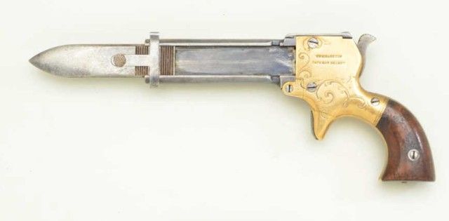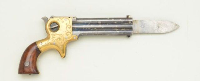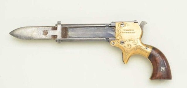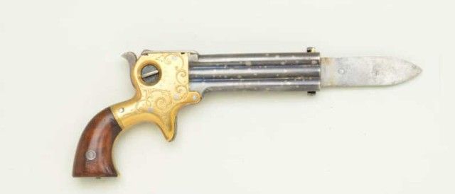 Marston three (3) shot .22 caliber derringer with sliding bayonet and factory scroll engraved. Serial #911. The barrel shows 30%-50% blue with considerable spotting on right side of barrel which has caused a lossof finish. The frame is sharp and crisp with traces of gold plate. The grips show 50% varnish with some scaling and losses. Grips are good overall the bayonet and small parts are original, the hammer shows considerablecase hardening and the action is not working. Only approximately 1400 of these are estimated to be produced and rare with original bayonet (probably only 100 made). Refer Flayderman 84-074. Note: rarer roundedspear point tip to knife blade. From an old N.Y. Collector’s Estate. Est.; $1,500-$3,000