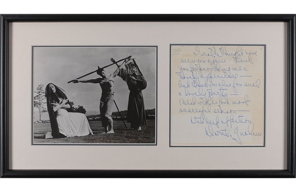 ALS, one page, 7 x 8, no date. Letter of thanks to an unknown recipient. In part: “I wish I might have seen you again. Thank you for providing me such a lovely experience—And thank you also for such a lovely party.” Double-matted and framed with a photo of Graham performing to an overall size of 22.5 x 12.5. In fine condition, with some toning to edges from previous display.