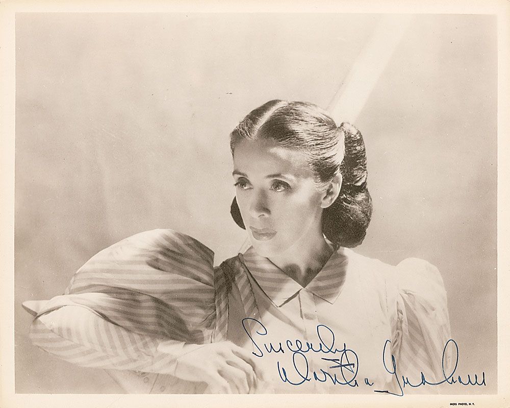 Highly influential dancer and choreographer (1894–1991) and creator of over 150 ballets. Vintage matte-finish 10 x 8 photo of Graham in a striped costume, signed in fountain pen. In fine condition. Accompanied by an unsigned glossy 8 x 10 head-and-shoulders photo of Graham.