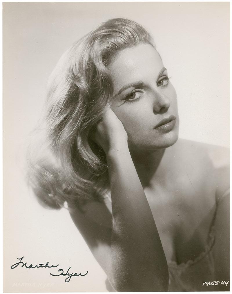 Vintage glossy 7.5 x 9.5 publicity photo of Hyer in a sultry pose, signed in ink “Martha Hyer.” In very good condition, with some light creasing and scratching, diagonal bend crossing her image, spotting to the emulsion, trimmed edges, and slight discoloration along the edges.