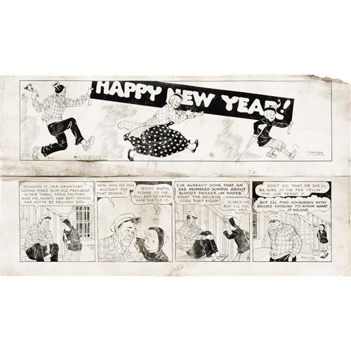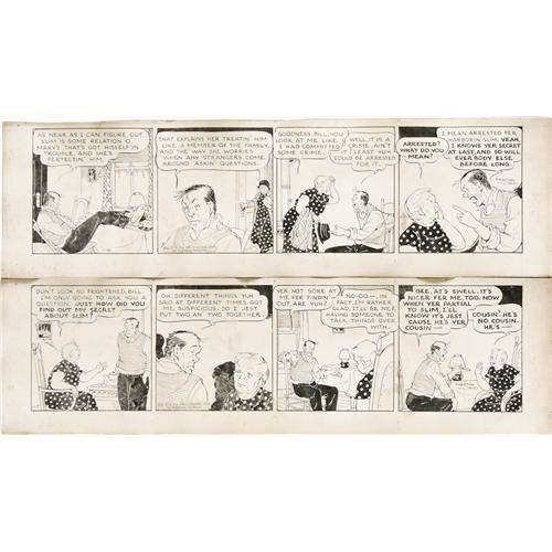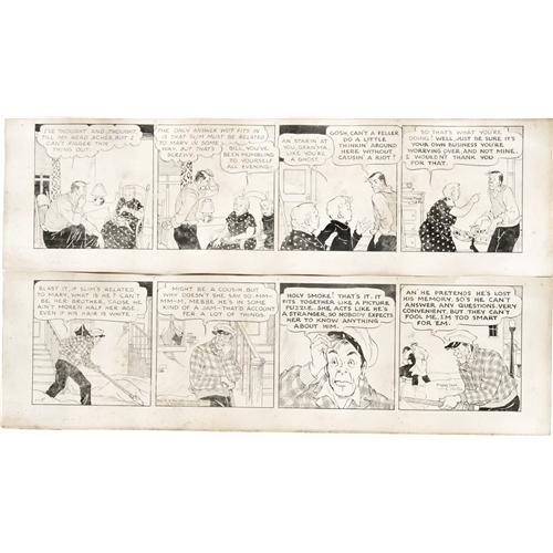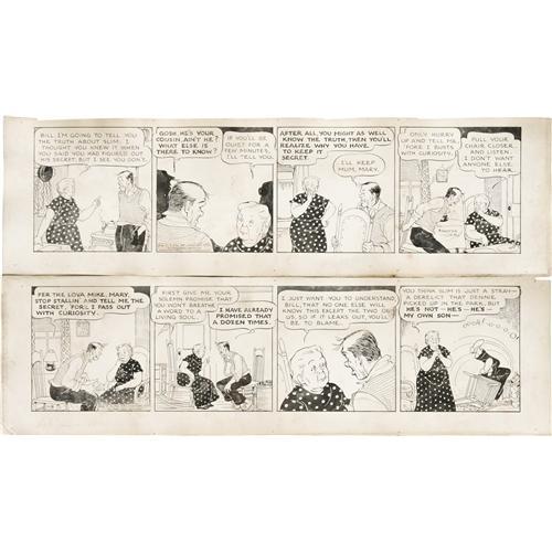 <B>Martha Orr - Apple Mary Daily Comic Strip Original Art, Group of 8 (Publisher's Syndicate, 1937).</B></I> Apple Mary and Dennie start the new year off with a mysterious melodrama in these eight consecutive dailies, dated 1-1-37 through 1-9-37. The image area of each daily measures 20" x 5". The art is water damaged, stained, and the paper is de-laminating; otherwise the art is in Fair condition. <BR><BR><B>Important notice:</B> Heritage usually auctions material at the rate of 200-250 lots per hour. On some occasions eBay Live bid software or the Internet may not be able to keep up with the pace of the auction. We recommend placing a realistic absentee bid now as insurance to avoid disappointment. Occasionally the auctioneer may eliminate or reject an eBay Live bid, and the auctioneer may also reopen a lot after the close of the eBay live bidding (usually because we missed an audience bid), and may reject your bid even if it shows you as the winning bidder. By bidding via eBay Live, you agree that Heritage may award the lot to another bidder at its sole discretion under the circumstances described above or any other reasonable circumstances. Since eBay bids are not shown to us until we open the lot on the floor, we treat those bids just like floor bids. In most cases the floor responds before the eBay bid is presented to us, due to Internet lag time, so for consistency we have made it a policy that floor bids are always considered first over tie eBay live bids. Also please note that all Heritage lots purchased through eBay Live carry a 22.5% Buyer's Premium. Please make sure you read the Terms and Conditions before you bid. This lot is being auctioned in conjunction with a live floor auction by Heritage Auction Galleries. All final auction and invoice information will be supplied by Heritage Auction Galleries, and all other information should be considered preliminary. Lot:41001 <BR><BR><B>Winning Notification and Billing:</B> After the FINAL session in this auction is complete, Heritage will send e-mail and snail mail invoices. This process normally takes several days. All final auction and invoice information will be supplied by Heritage Auction Galleries, and all other information should be considered preliminary. <BR><BR>This auction will be conducted on a live auction floor and over the Internet through eBay Live. If you choose to place an absentee bid, please take a moment to <font color='#0000ff'><u><a href='http://pages.ebay.com/liveauctions/help/before/laabsentee.html'>learn how eBay Live absentee bidding works</a></u></font><font color='#000000'>