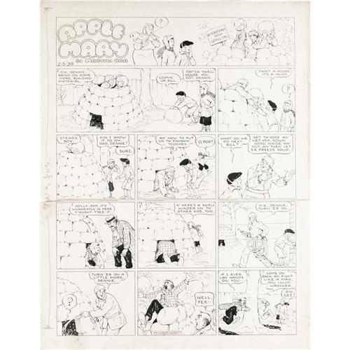 <B>Martha Orr - Apple Mary Sunday Comic Strip Original Art, dated 2-5-39 (Publisher's Syndicate, 1939).</B></I> Apple Mary, Dennie, and the gang enjoy a bit of wintertime fun in this frolicsome Sunday. The image area of this strip measures 18.5" x 25.5". This Sunday was cut between panel tiers three and four; otherwise, the art is in Good condition. <BR><BR><B>Important notice:</B> Heritage usually auctions material at the rate of 200-250 lots per hour. On some occasions eBay Live bid software or the Internet may not be able to keep up with the pace of the auction. We recommend placing a realistic absentee bid now as insurance to avoid disappointment. Occasionally the auctioneer may eliminate or reject an eBay Live bid, and the auctioneer may also reopen a lot after the close of the eBay live bidding (usually because we missed an audience bid), and may reject your bid even if it shows you as the winning bidder. By bidding via eBay Live, you agree that Heritage may award the lot to another bidder at its sole discretion under the circumstances described above or any other reasonable circumstances. Since eBay bids are not shown to us until we open the lot on the floor, we treat those bids just like floor bids. In most cases the floor responds before the eBay bid is presented to us, due to Internet lag time, so for consistency we have made it a policy that floor bids are always considered first over tie eBay live bids. Also please note that all Heritage lots purchased through eBay Live carry a 22.5% Buyer's Premium. Please make sure you read the Terms and Conditions before you bid. This lot is being auctioned in conjunction with a live floor auction by Heritage Auction Galleries. All final auction and invoice information will be supplied by Heritage Auction Galleries, and all other information should be considered preliminary. Lot:41001 <BR><BR><B>Winning Notification and Billing:</B> After the FINAL session in this auction is complete, Heritage will send e-mail and snail mail invoices. This process normally takes several days. All final auction and invoice information will be supplied by Heritage Auction Galleries, and all other information should be considered preliminary. <BR><BR>This auction will be conducted on a live auction floor and over the Internet through eBay Live. If you choose to place an absentee bid, please take a moment to <font color='#0000ff'><u><a href='http://pages.ebay.com/liveauctions/help/before/laabsentee.html'>learn how eBay Live absentee bidding works</a></u></font><font color='#000000'>