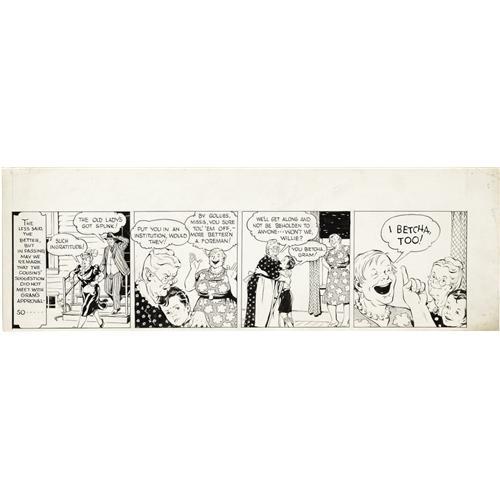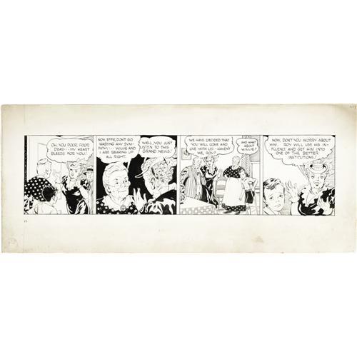 <B>Martha Orr - The Tenth and Eleventh Apple Mary/Mary Worth Daily Comic Strip Original Art (Publisher's Syndicate, 1934).</B></I> Grams and Willie are on a roll now, and are tugging at their reader's heartstrings. The image area of each daily measures 20" x 5", and the art is in Very Good condition. <BR><BR><B>Important notice:</B> Heritage usually auctions material at the rate of 200-250 lots per hour. On some occasions eBay Live bid software or the Internet may not be able to keep up with the pace of the auction. We recommend placing a realistic absentee bid now as insurance to avoid disappointment. Occasionally the auctioneer may eliminate or reject an eBay Live bid, and the auctioneer may also reopen a lot after the close of the eBay live bidding (usually because we missed an audience bid), and may reject your bid even if it shows you as the winning bidder. By bidding via eBay Live, you agree that Heritage may award the lot to another bidder at its sole discretion under the circumstances described above or any other reasonable circumstances. Since eBay bids are not shown to us until we open the lot on the floor, we treat those bids just like floor bids. In most cases the floor responds before the eBay bid is presented to us, due to Internet lag time, so for consistency we have made it a policy that floor bids are always considered first over tie eBay live bids. Also please note that all Heritage lots purchased through eBay Live carry a 22.5% Buyer's Premium. Please make sure you read the Terms and Conditions before you bid. This lot is being auctioned in conjunction with a live floor auction by Heritage Auction Galleries. All final auction and invoice information will be supplied by Heritage Auction Galleries, and all other information should be considered preliminary. Lot:41001 <BR><BR><B>Winning Notification and Billing:</B> After the FINAL session in this auction is complete, Heritage will send e-mail and snail mail invoices. This process normally takes several days. All final auction and invoice information will be supplied by Heritage Auction Galleries, and all other information should be considered preliminary. <BR><BR>This auction will be conducted on a live auction floor and over the Internet through eBay Live. If you choose to place an absentee bid, please take a moment to <font color='#0000ff'><u><a href='http://pages.ebay.com/liveauctions/help/before/laabsentee.html'>learn how eBay Live absentee bidding works</a></u></font><font color='#000000'>