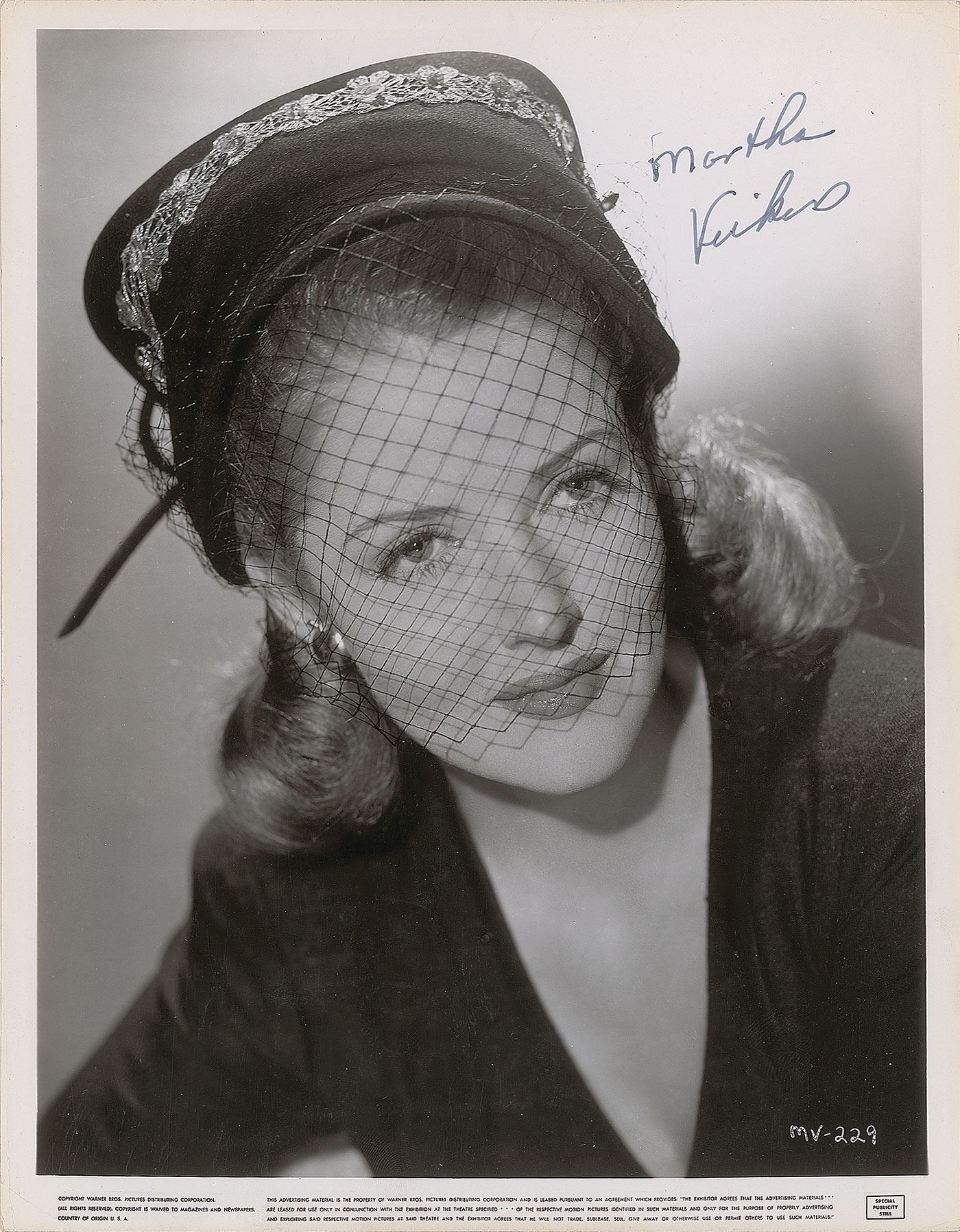 American model and actress (1925–1971) whose first film role was a small uncredited part in Frankenstein Meets the Wolf Man. Vintage glossy 8 x 10.25 Warner Bros. publicity photo of Vickers as Carmen Sternwood for the 1946 film The Big Sleep, signed in fountain pen. Reverse bears an affixed film caption. In fine condition, with some light crazing along the top edge.