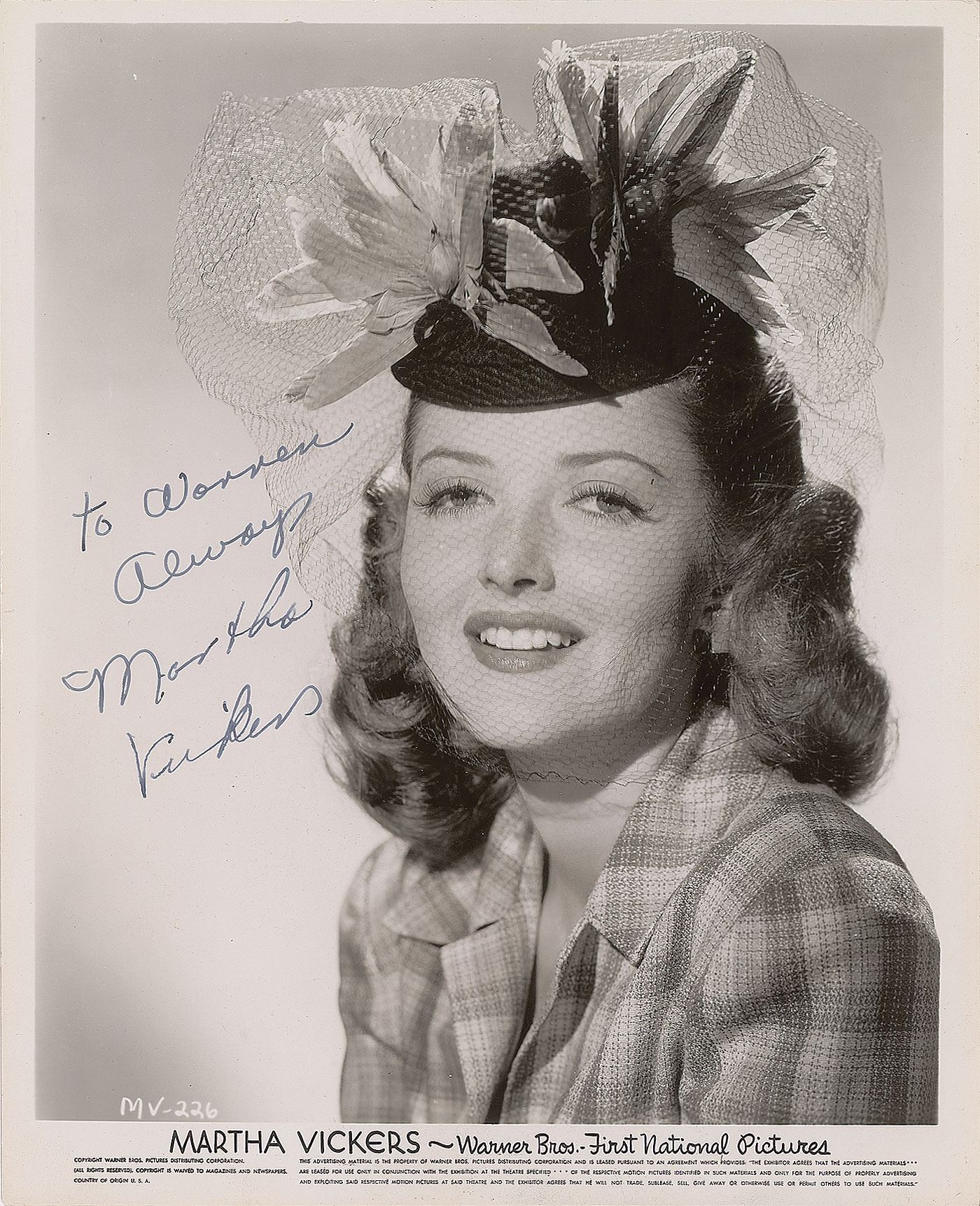 American model and actress (1925–1971) whose first film role was a small uncredited part in Frankenstein Meets the Wolf Man. Vintage glossy 8 x 10 Warner Bros.–First National Pictures publicity photo of Vickers wearing an ornate veil, signed and inscribed in fountain pen, "To Warren, Always, Martha Vickers.” In fine condition, with a light horizontal bend.