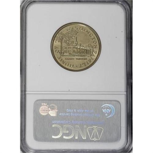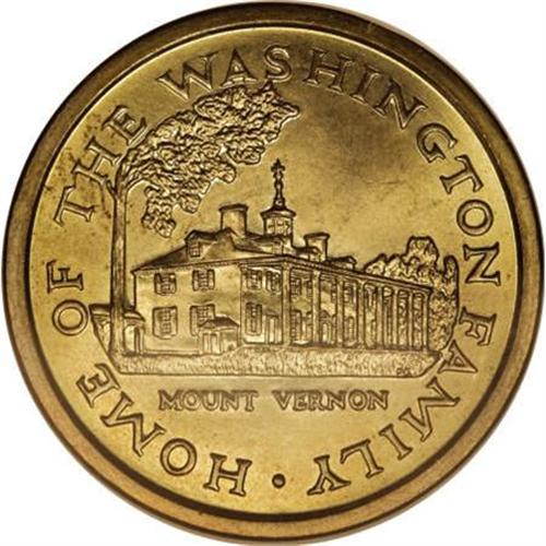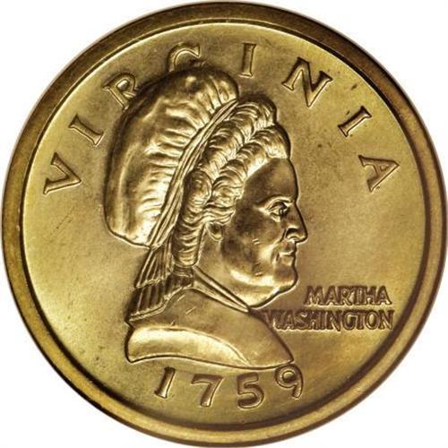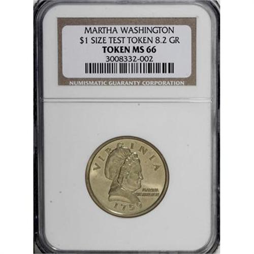<B>(1999) Martha Washington "Dollar," Judd-2185, Low R.7, MS66 NGC.</B></I> 8.2 gm. The 1759-dated obverse has a portrait of Martha Washington facing right, while the reverse shows a view of Mount Vernon. These dies, which omit a denomination and the UNITED STATES OF AMERICA, have been used by the Mint to test coinage alloys since 1965. Struck in magnesium brass-coated copper-clad metal with a plain edge. The consistent green-gold color is similar to that of the Sacagawea dollar, which succeeded the Anthony dollar in 2000. An intricately struck Premium Gem with vibrant satin luster and a virtually immaculate reverse. The obverse has only a few minuscule ticks. Only a single example of this pattern has previously appeared in a Heritage auction, as lot 11257 in our November 2003 New York Signature. ANR auctioned an MS63 example in December 2003 for $20,700.<BR><BR><b>Shipping:</b> Coins & Currency (<a target="_blank" href="http://www.heritageauctions.com/common/shipping.php">view shipping information</a>)