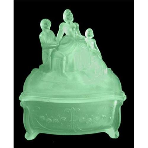 Known as Martha Washington, shown and described on pages 26-27 of Whitmyer - Bedroom & Bathroom Glassware of the Depression Years. The finial is comprised of three figures - a colonial lady flanked by a boy and a girl. The jar is embossed with garlands of roses. Produced by the New Martinsville Glass Co., during the years 1937-1944, in green satin or frosted Depression glass. Measuring about 7 inches tall x 5 1/2 inches long x 4 inches wide, and with the exception of a couple of tiny nicks to the rim of the base, this jar and lid are in excellent condition.