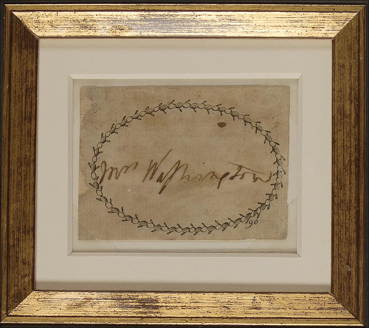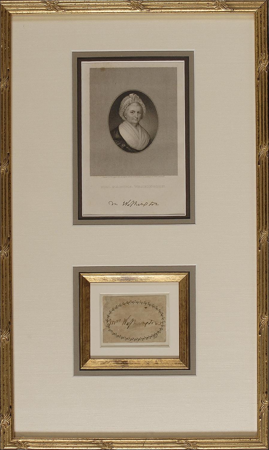 Extremely rare ink signature, “Mrs. Washington,” on an off-white 2.5 x 1.75 card, with Washington signing within a floral design. Double cloth matted and framed with an engraved portrait, to an overall size of 10.5 x 17.5. In very good condition, with moderate toning and soiling, and some light surface loss or professional paper restoration to left edge, not affecting signature. Uncommon in any form.