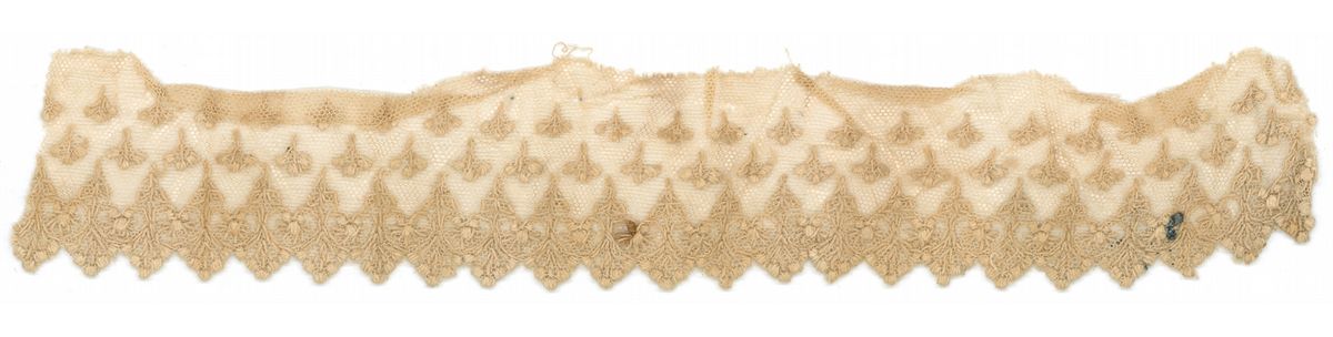 Unique piece of ivory-colored lace belonging to Martha Washington, measuring approximately 11 x 1.5, featuring an ornate and elaborate sheer design. In fine condition, with overall toning. Accompanied by a color copy of the decorative cover of the box in which the lace was kept. Provenance: the Tobias Lear family, James D. Julia Auction, February 5, 2010. Lear, Washington’s trusted friend and personal secretary from 1784 until his death, took nieces of Martha Washington for both his second and third wives. Memorabilia related to Martha is very scarce and thus quite desirable.