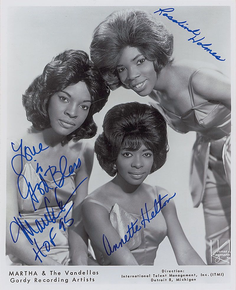 Glossy 10 x 12.5 publicity photo of the group, signed in blue felt tip by all three, with Martha adding, “Love & God Bless, HOF 95.” In fine condition.