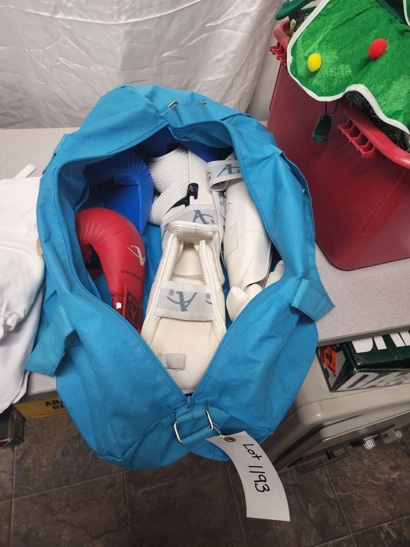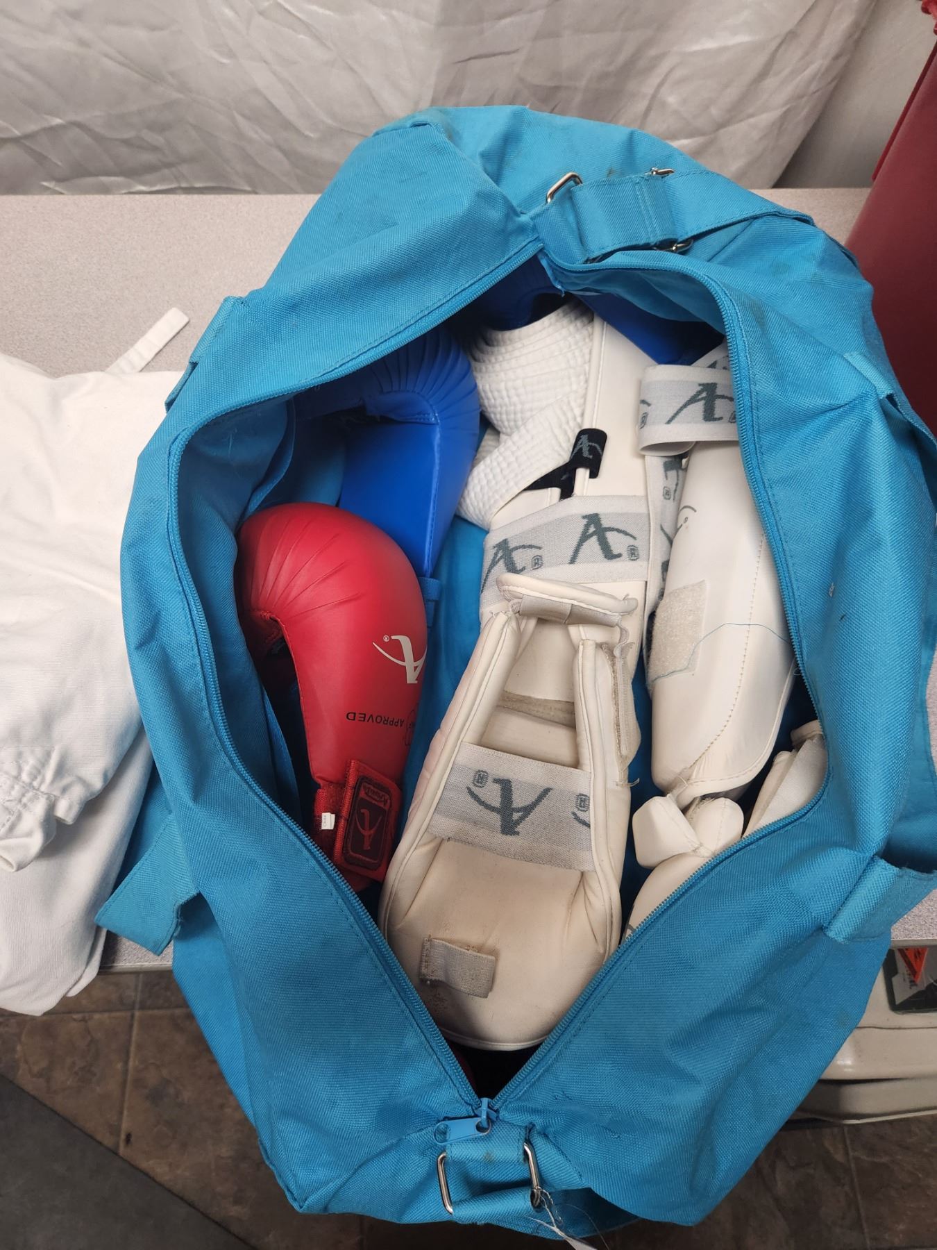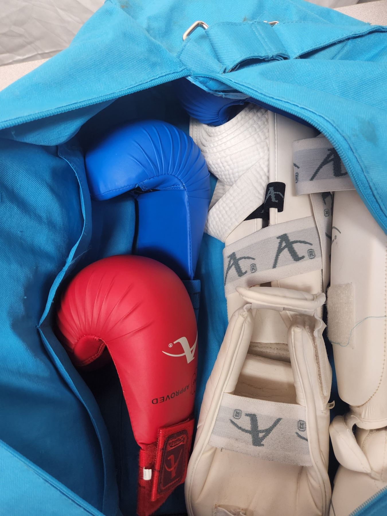 Martial Arts Karate Suit, Gloves x2, and Knee Pads in Blue Dufflebag