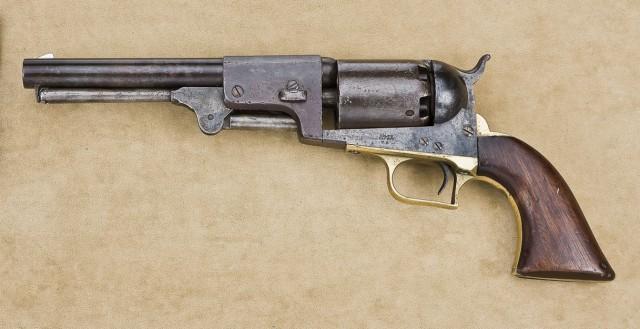 Martially-inspected early Colt First Model Dragoon percussion pistol, .44 cal., 7-1/2” barrel, blue and case hardened finish, wood grips, #2180. This gun is in overall good + to very good condition showing a dark patina on the barrel assembly, cylinder and frame with scattered areas of erosion and pin prick pitting, the brass straps are of the very early wide variation with a mellow patina and the serial numbers are small and all matching on the frame, barrel assembly, cylinder, arbor, trigger guard and back strap; the wedge is un-numbered. The cylinder scene is approx. 30% visible as is a portion of the pressure ridge; there are faint traces of case color on the frame and the markings, including a number of inspector stamps are visible with the “Colt’s Patent U.S.” on the left side of the frame being very clear. The loading lever shows scattered light pitting with a functioning latch; the action is crisp, the bore overall good with some scattered points of erosion; the grips are overall good with wear and several marks and scratches from carry and storage; both cartouches are visible. An opportunity to obtain an early desirable First Model Dragoon in surprisingly good condition as