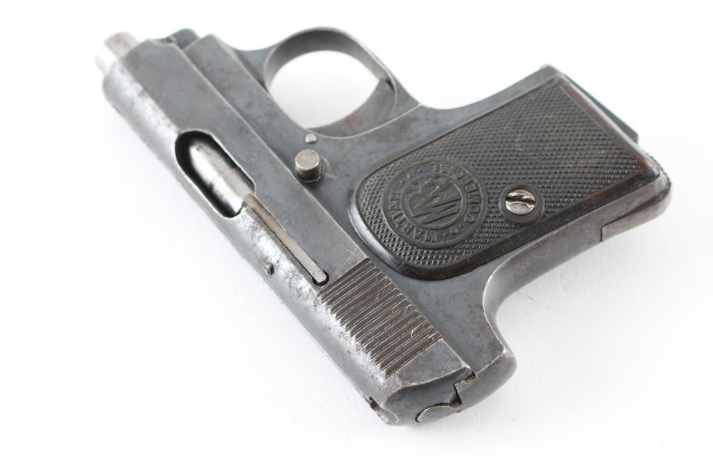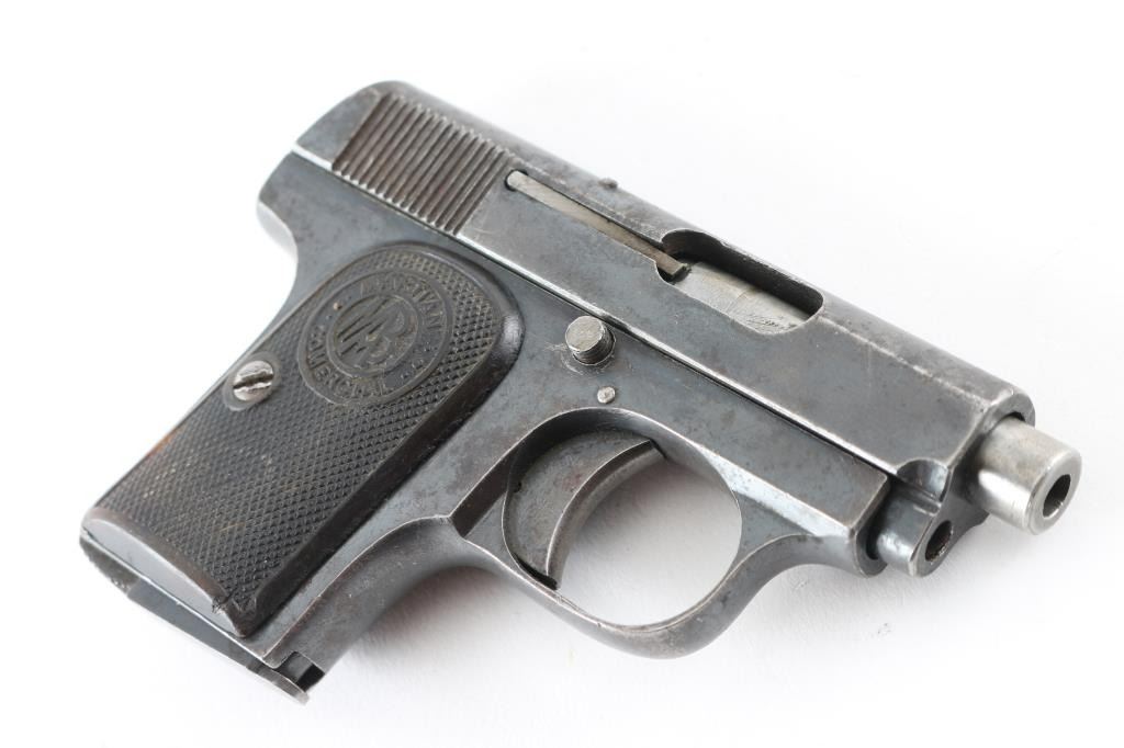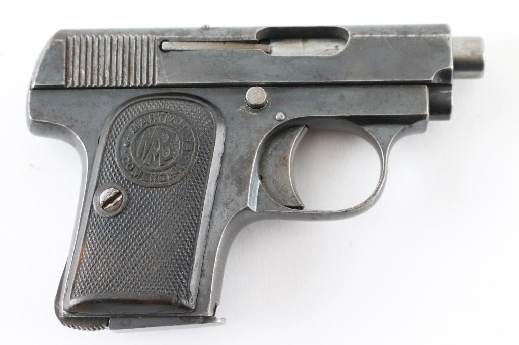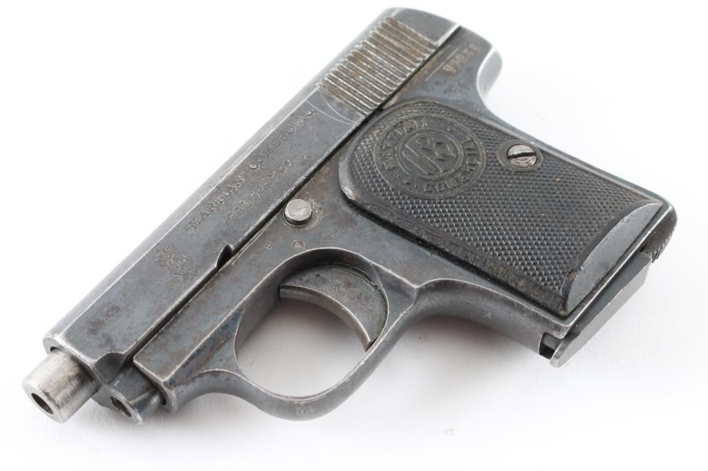 Spanish made pistol from the Eibar region, "Ruby" style pocket pistol. Estimated dates circa 1920's thru 1930's. Features blued finish, checkered black gutta percha grips with "MAB" logos, 2.3" barrel (slightly extends past slide), heel magazine catch, missing thumb safety (currently has a steel pin straight thru the frame filling the hole). Bore is good condition, a bit dark. Retains 20% finish, scuffed & scratched, edge losses, patina. Grips are good, solid condition. Action has issues, slide hesitates, internals need repair. Slide marked "6.35", the breech block is rimfire and the barrel is chambered for 22 cal. Magazine fed lips look like 25 auto magazine lips, not 22RF. Magazine not retained by catch, appears to be incorrect magazine. Condition is NRA Poor (needs repair) *** C&R Firearm ***