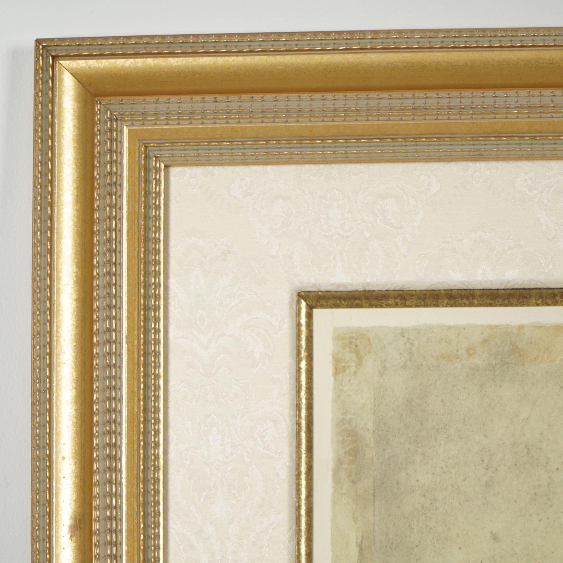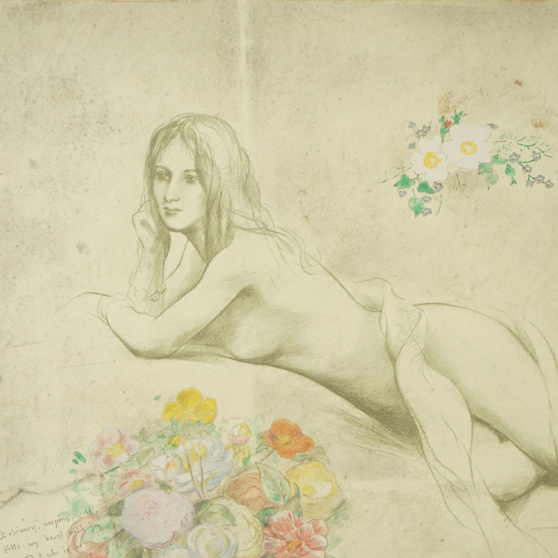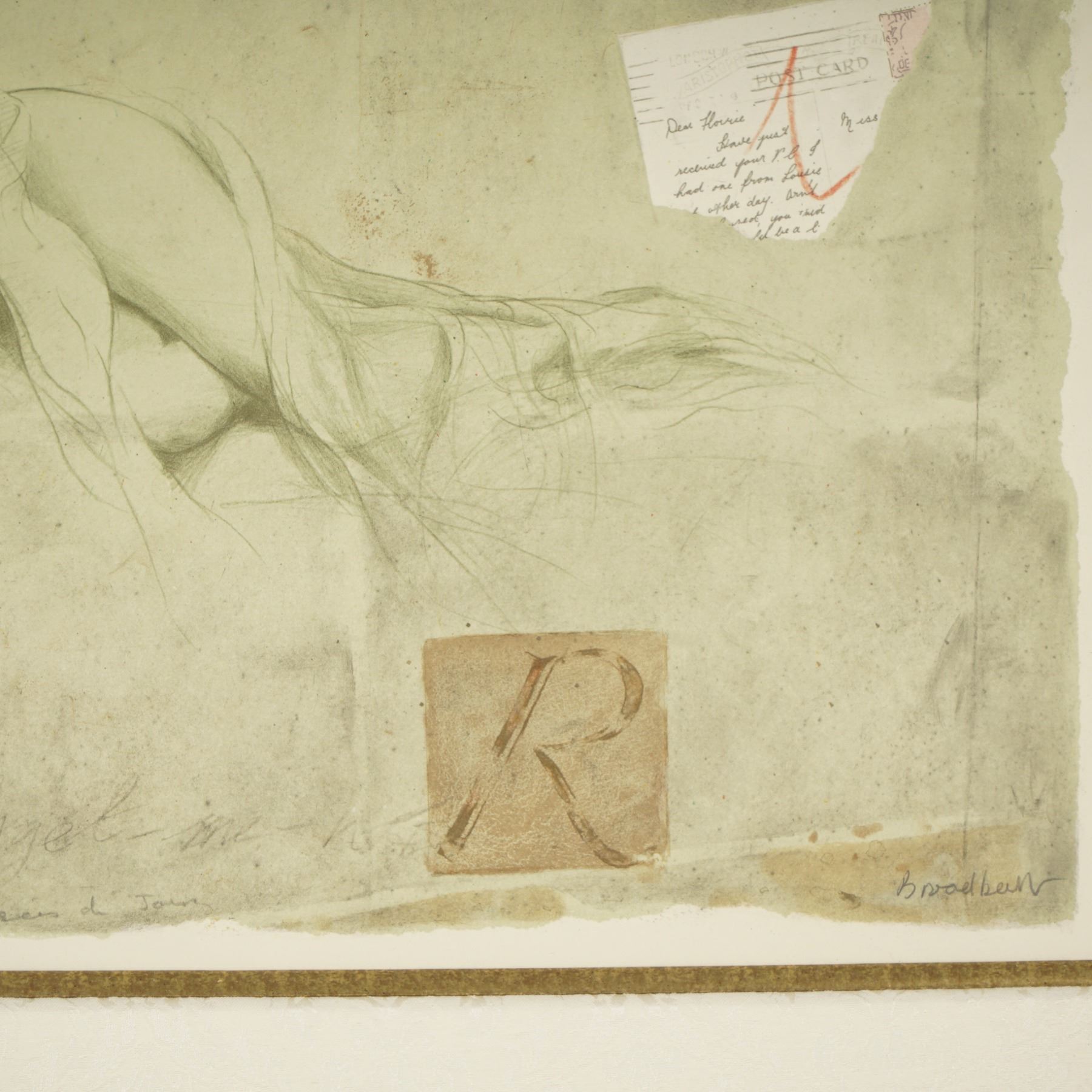 This evocative lithograph titled Thoughts of the Day (Pensees du Jour) by English artist Martin Broadbent captures a reclining nude rendered in soft pencil tones, framed by vibrant floral accents and poetic script. The composition merges classical figuration with subtle surrealist motifs, integrating handwritten notes, watercolor blossoms, and a vintage-style postcard element. Martin Broadbent is a British artist known for his sensitive figurative studies and refined printmaking. His works often feature poetic imagery and blend narrative with delicate draftsmanship. Broadbent has exhibited widely throughout the UK and internationally, earning a following for his romantic and emotionally nuanced works on paper. Signed Broadbent in the lower right and stamped with an embossed R monogram, the work is bordered in an elegant double-mat and presented in an ornate gold frame, enhancing its romantic and contemplative character. Edition number 282/350.