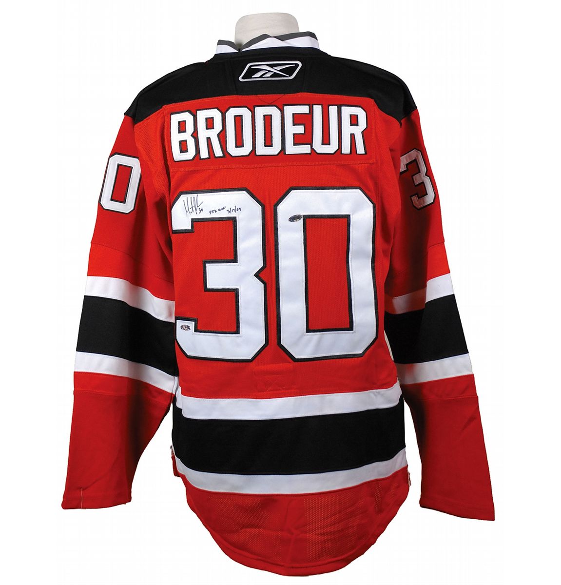 Official Reebok replica New Jersey Devils hockey jersey, with sewn on letters and numbers, signed in black felt tip on the number on the back, “Martin Brodeur 30, 557 Win 3/17/09.” In very fine condition. Accompanied by a certificate of authenticity from Steiner.