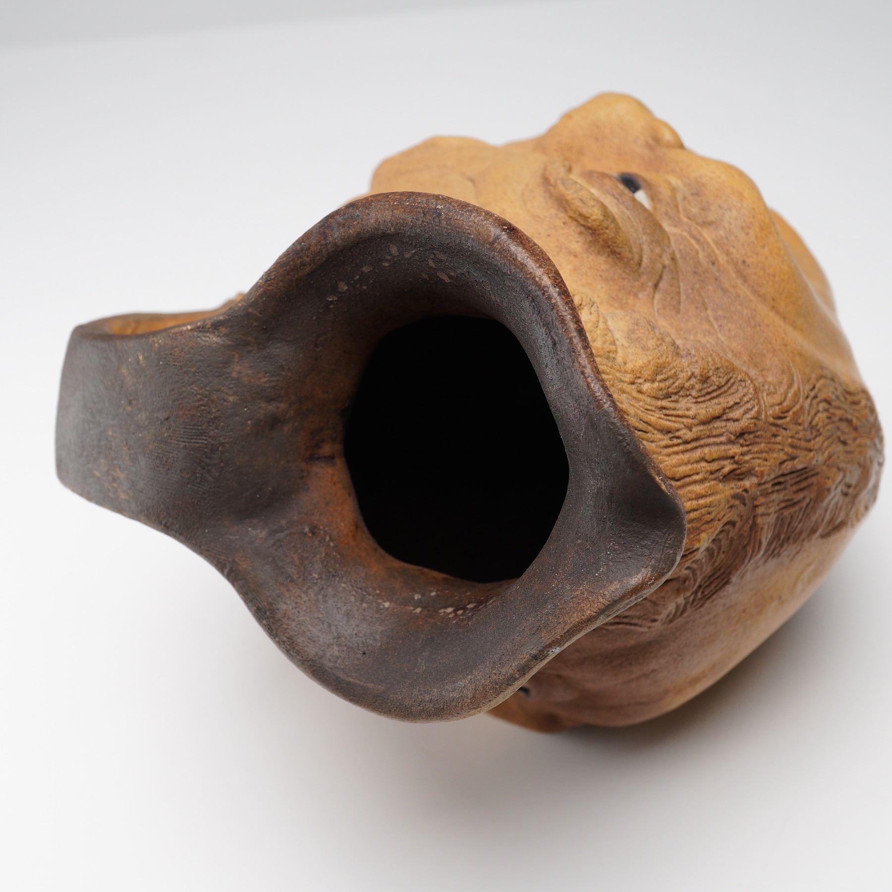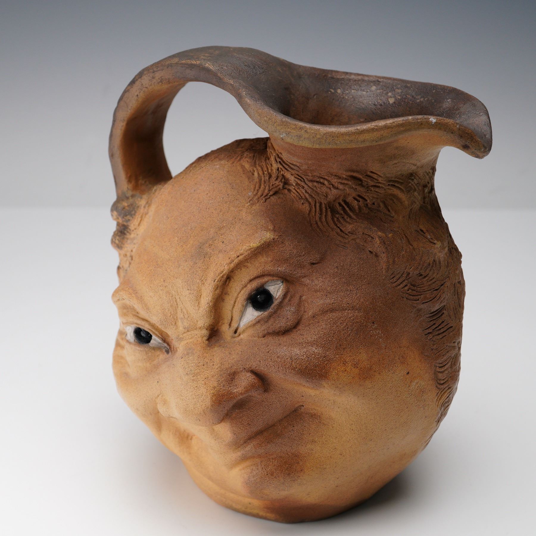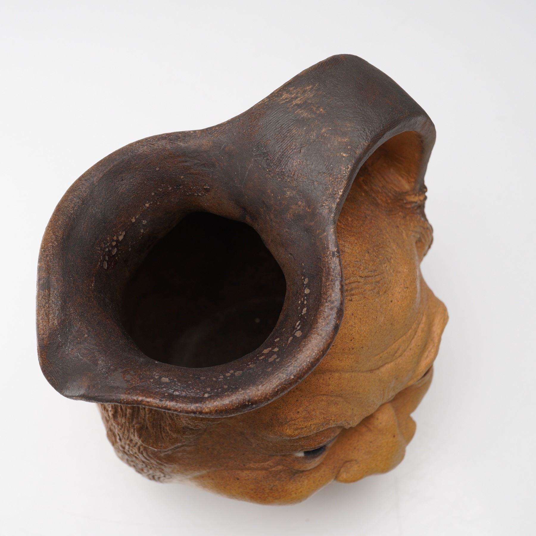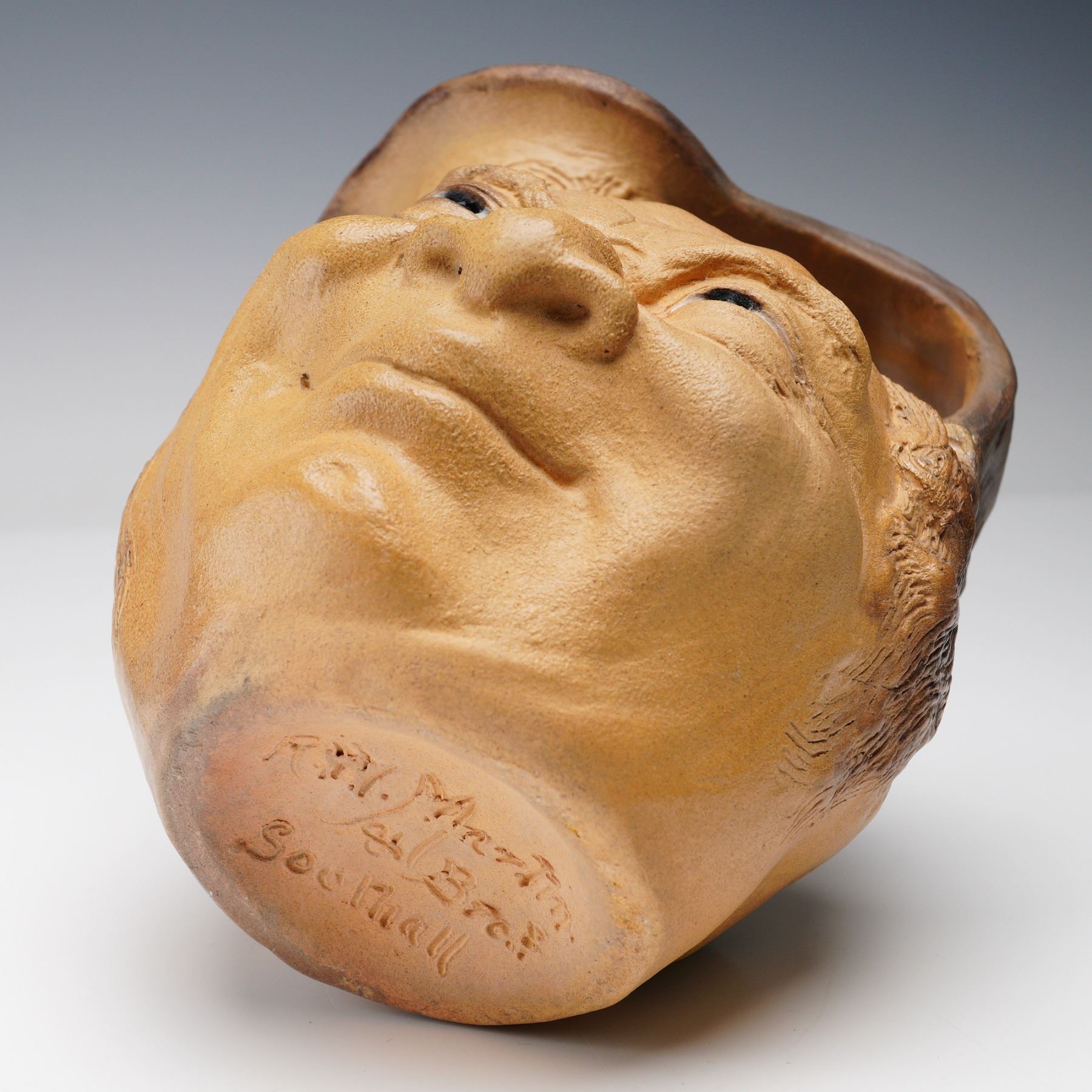 Featuring a double-sided design with distinct expressive visages. The jug is hand-modeled with detailed facial features, textured hair, and a natural brown glaze transitioning from lighter tan to darker tones around the rim. The top opening is irregularly shaped, with a smoothly integrated handle forming part of the sculpted head. The underside signed R.W. Martin Bros. Southall.