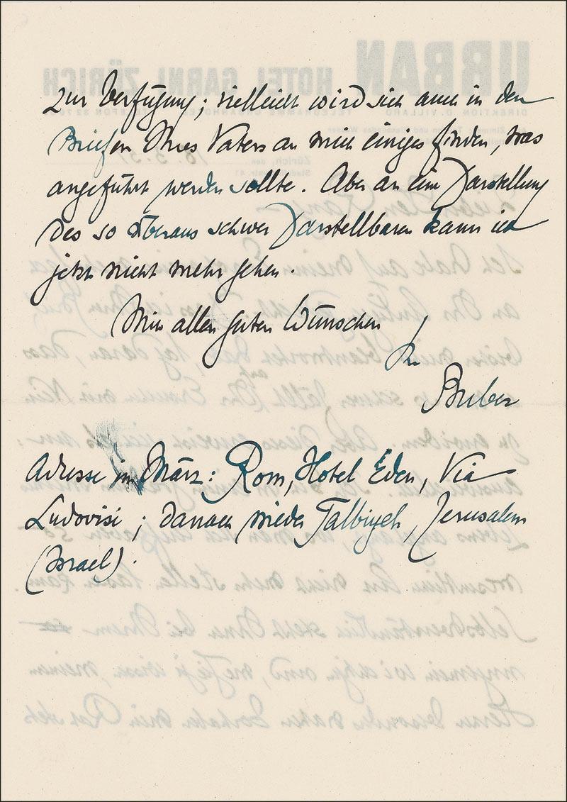German Jewish philosopher and writer (1878–1965) who evolved a philosophy inspired by study of Hasidism and based on the encounter of man with nature, man, and God. ALS in German, signed “Buber,” one page both sides, 5.75 x 8.25, Urban Hotel Garni Zurich letterhead, March 18, 1957. Letter to Mr. Rang rejecting an assignment. In part (translated): “I have reached a stage in my life where one cannot allow oneself to take on tasks of such a fundamental nature.” Buber then offers complete access to his advice regarding his father and the correspondence between them. In fine condition. RRAuction COA.
