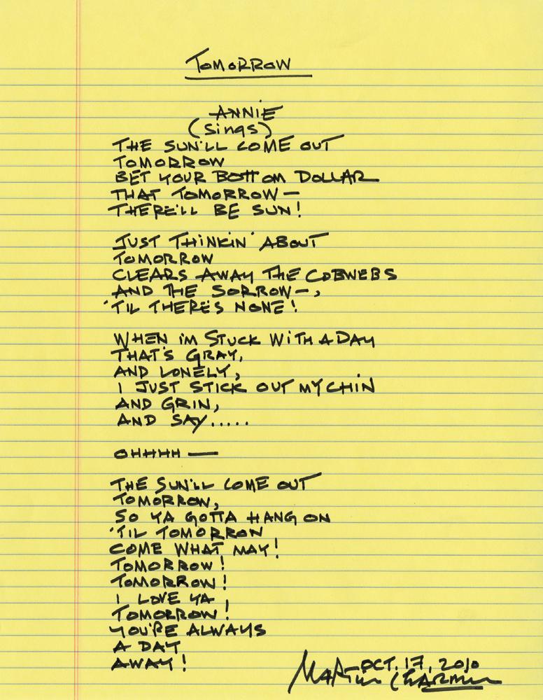 Martin Charnin autograph manuscript lyrics to “Tomorrow” from the Broadway production of Annie