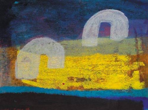 <B>Martin Finnin (b.1968)</B><BR>THE DREAMING HAYSTACKS<BR>signed and dated [2005] lower left; inscribed, signed and dated again on reverse<BR>oil on handmade paper<BR>57 by 75cm., 22.5 by 29.75in.<BR><BR>