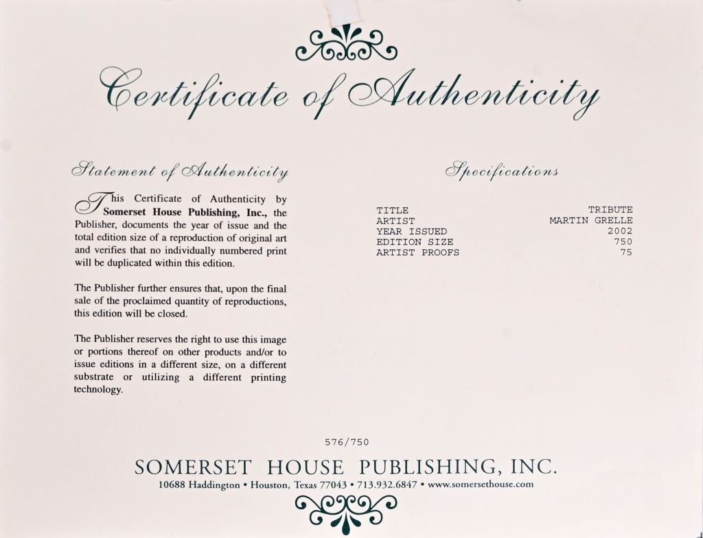 Signed lower right by Martin Grelle, numbered 576/750. Frame measures 34.5" x 41.5". Includes COA
