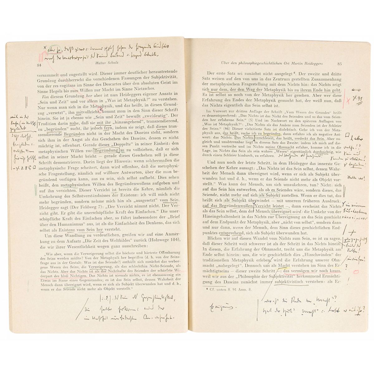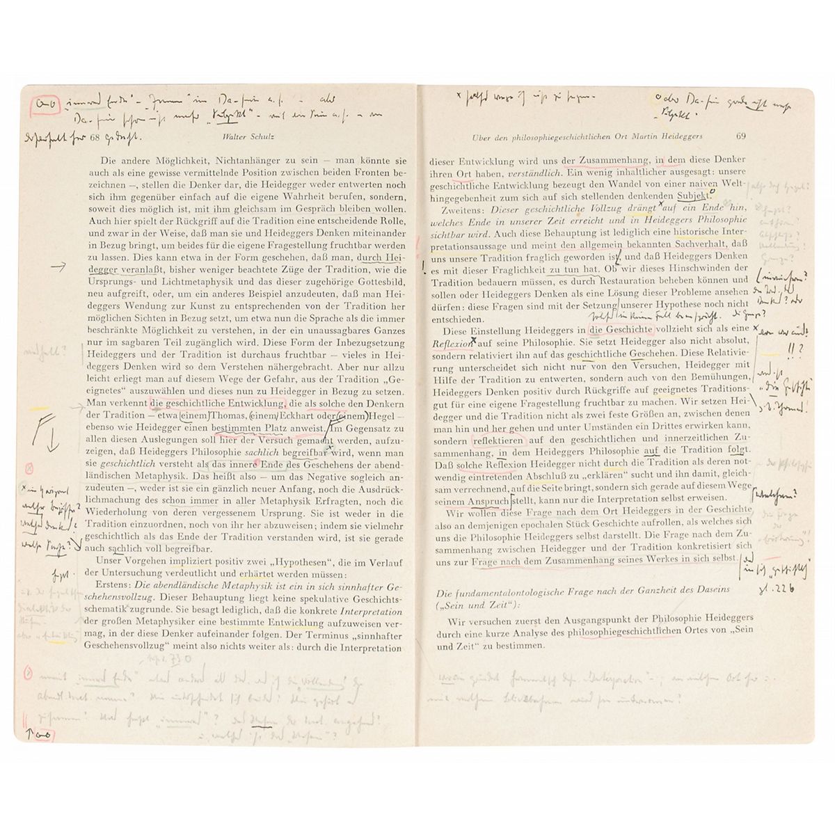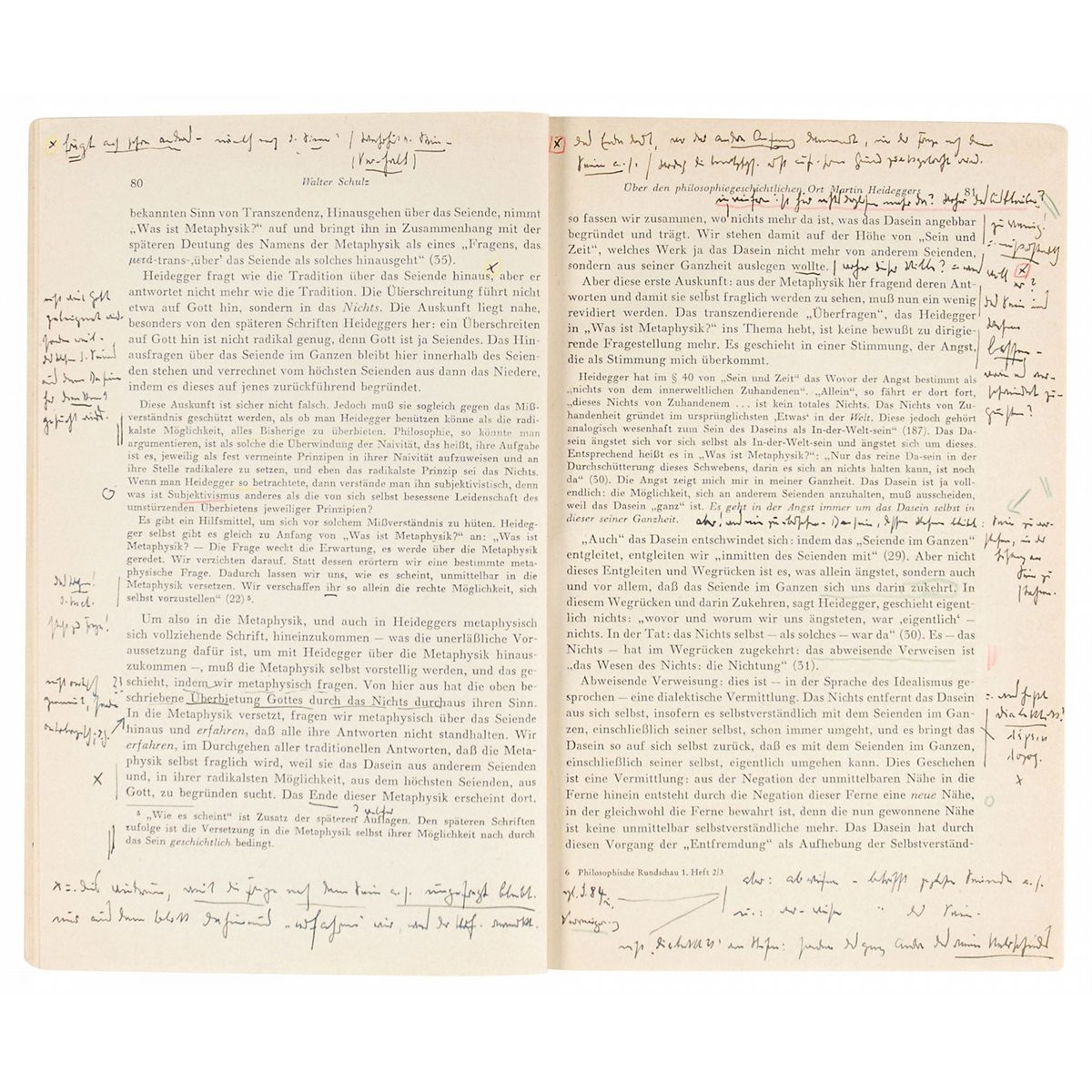 Important German philosopher (1889–1976) whose Being and Time was a fundamental text in the development of existentialism. Signed journal publication in German: Philosophische Rundschau, Issue 2/3. Tubingen: J. C. B. Mohr, 1953–54. Paperback, 5.75 x 8.75, 28 pages (numbered 66–93). An academic journal containing an article entitled ‘Uber Den Philosophiegeschichtlichen ort Martin Heideggers’ by Walter Schulz, unsigned but heavily notated throughout by Heidegger in ink and pencil, with underlined text and written comments on nearly every page, completely filling the margins of most pages. In fine condition, with a chip to the upper corner of the cover. Schulz’s important article discusses Heidegger’s place in the history of philosophy, and is still frequently cited in academic works. The critical piece attempts to trace the evolution of Heidegger’s thinking beginning with the publication of his chief work, Being and Time, focusing especially on what has become known as ‘the turn’ in his philosophy. A remarkable example of the respected philosopher’s inner thoughts at a point in his career when his contributions were already being contextualized within the history of his field—in penning his observations throughout this text, Heidegger is not only responding to an analysis of his work and theory, but evaluating his own legacy.