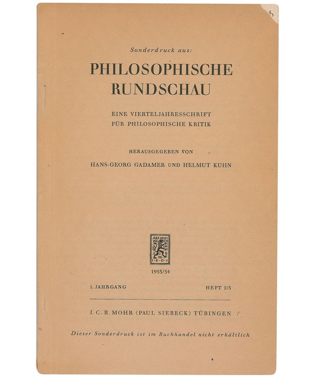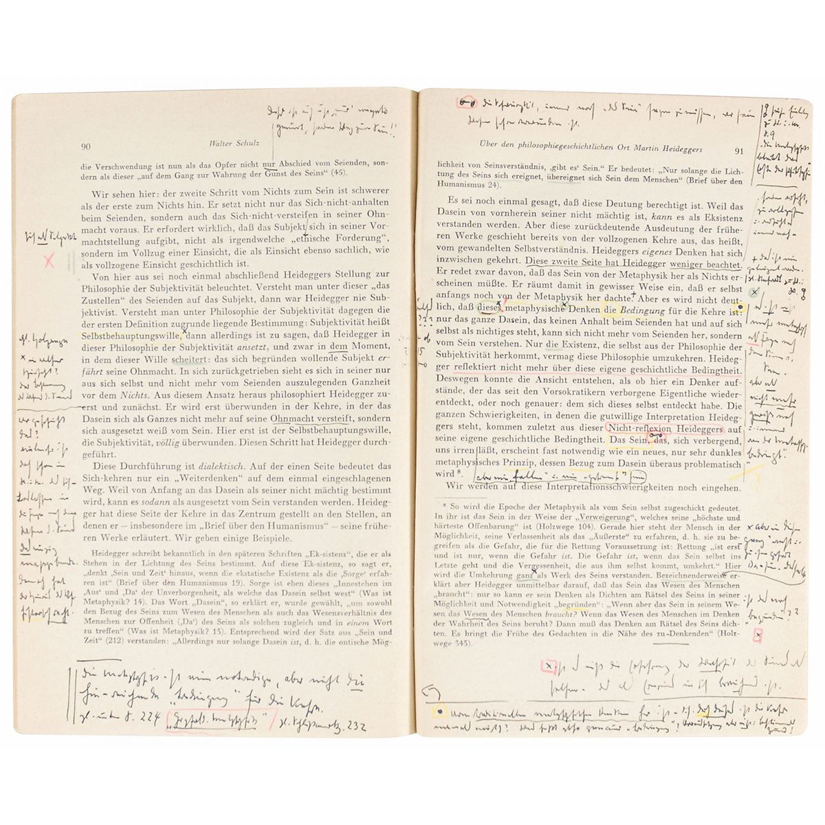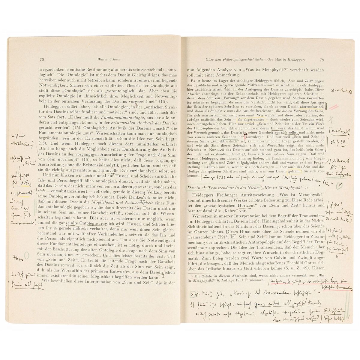Important German philosopher (1889–1976) whose Being and Time was a fundamental text in the development of existentialism. Signed journal publication in German: Philosophische Rundschau, Issue 2/3. Tubingen: J. C. B. Mohr, 1953–54. Paperback, 5.75 x 8.75, 28 pages (numbered 66–93). An academic journal containing an article entitled ‘Uber Den Philosophiegeschichtlichen ort Martin Heideggers’ by Walter Schulz, unsigned but heavily notated throughout by Heidegger in ink and pencil, with underlined text and written comments on nearly every page, completely filling the margins of most pages. In fine condition, with a chip to the upper corner of the cover. Schulz’s important article discusses Heidegger’s place in the history of philosophy, and is still frequently cited in academic works. The critical piece attempts to trace the evolution of Heidegger’s thinking beginning with the publication of his chief work, Being and Time, focusing especially on what has become known as ‘the turn’ in his philosophy. A remarkable example of the respected philosopher’s inner thoughts at a point in his career when his contributions were already being contextualized within the history of his field—in penning his observations throughout this text, Heidegger is not only responding to an analysis of his work and theory, but evaluating his own legacy.
