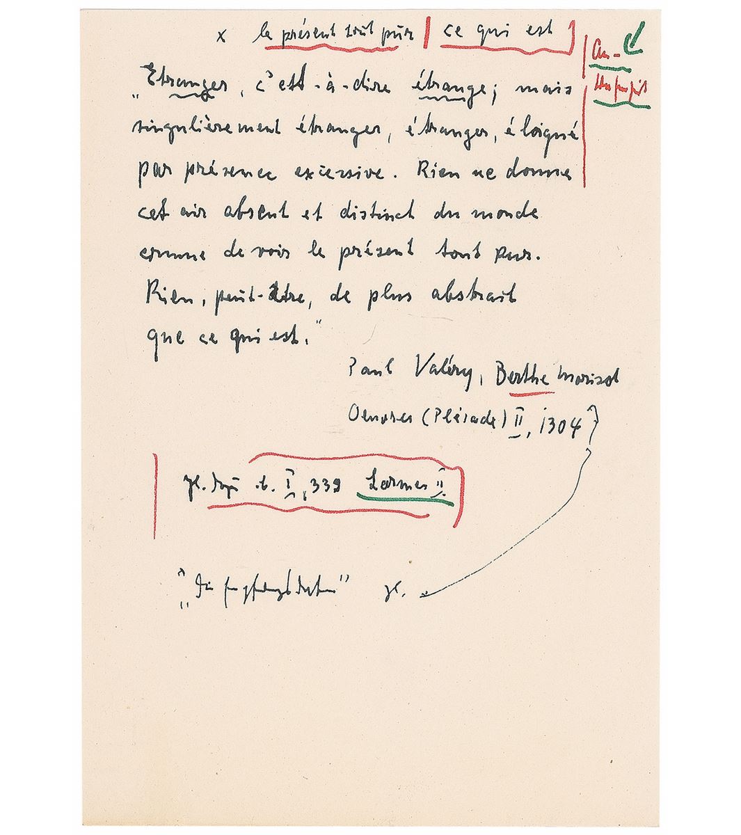 Handwritten notes in German, unsigned, one page, 4 x 5.75, no date. Untranslated notes mentioning “Paul Valery” and “Berthe Morisot.” In fine condition.