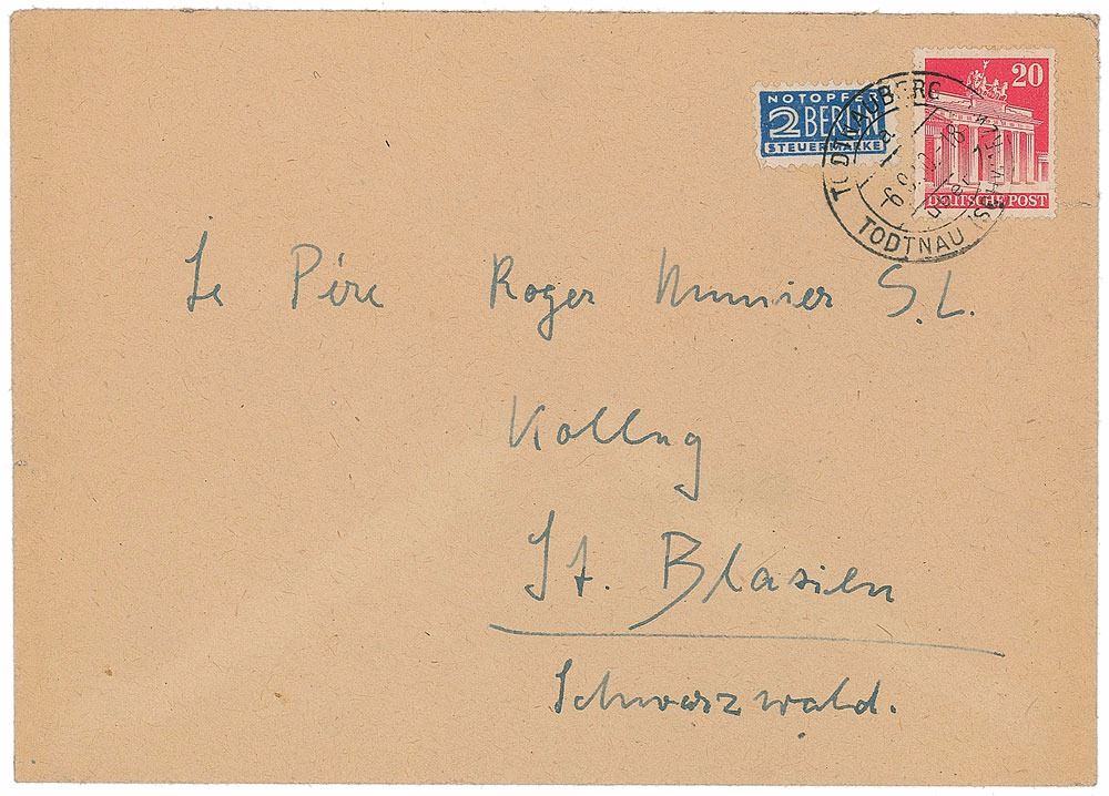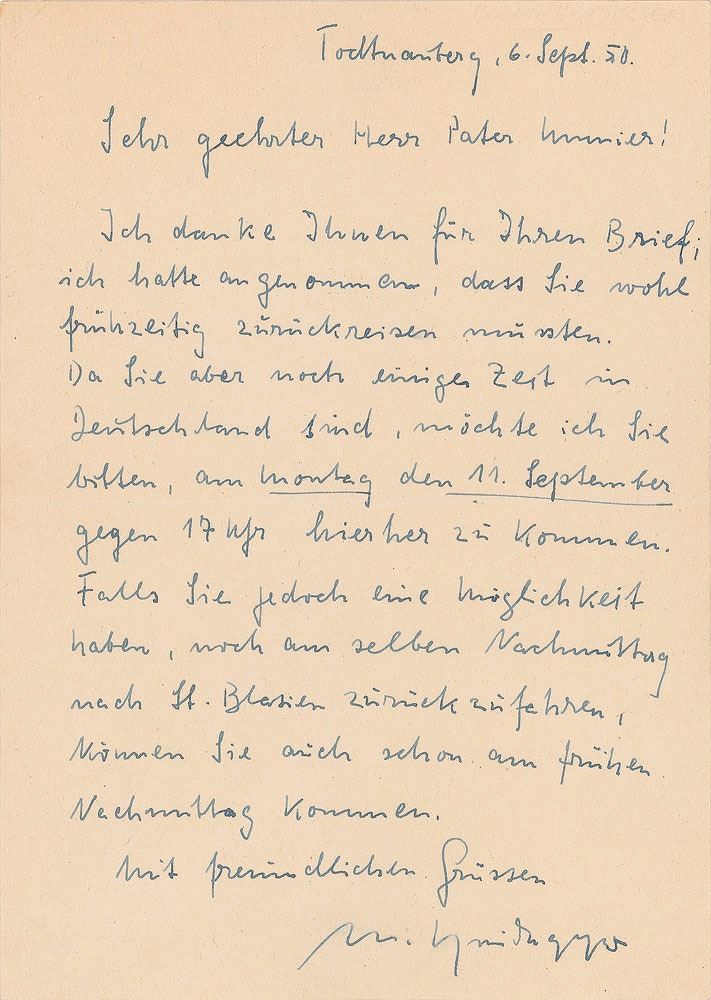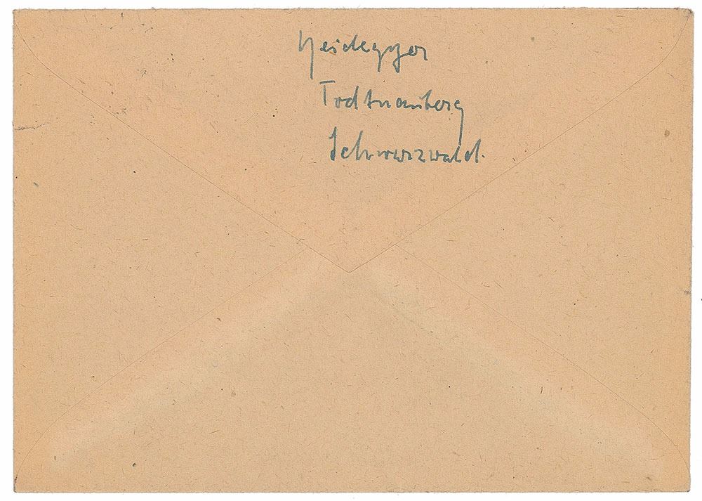 Important German philosopher (1889–1976) whose Being and Time was a fundamental text in the development of existentialism. Untranslated ALS in German, signed “M: Heidegger,” one page, 5.75 x 8.25, September 6, 1950. In fine condition. Accompanied by the original mailing envelope, addressed in Heidegger's hand and incorporating his surname in the return address on the flap.