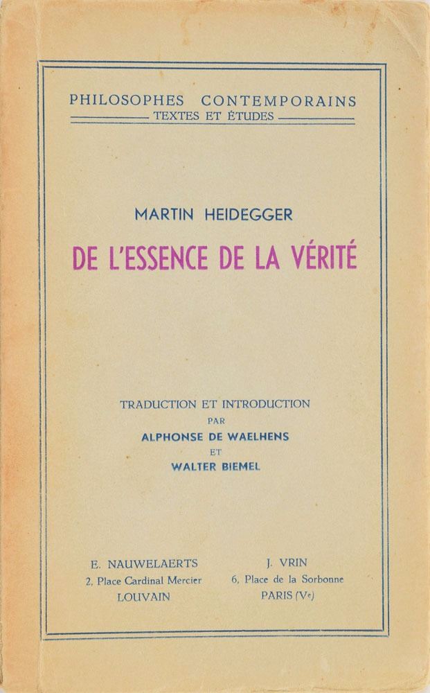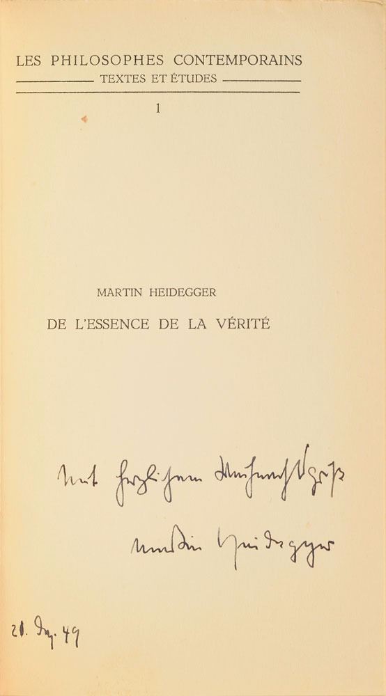 Important German philosopher (1889–1976) whose Being and Time was a fundamental text in the development of existentialism. Signed book in French: De l'essence de la vérité. Paris: Louvain: E. Nauwelaerts/Paris: Joseph Vrin, 1948. Softcover, 4.75 x 7.5, 106 pages. Signed on half-title page in German in fountain pen (translated), "With a warm Christmas greeting, Martin Heidegger, 20. Dec. 49." Autographic condition: fine. Book condition: VG-/None, with small tears at spine, and some toning and soiling to edges.