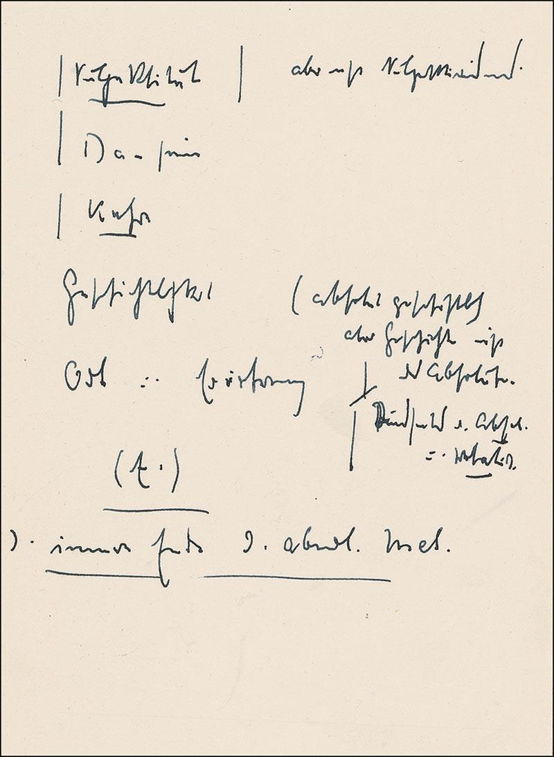 Unsigned handwritten manuscript on a 4.25 x 5.5 off-white sheet. Heidegger pens a portion his most famous work “Sein und Zeit.” In part (translated): “To be (Da Sein) History (abstract historical or history is not absolute, place: discussion).” In fine condition. RRAuction COA.